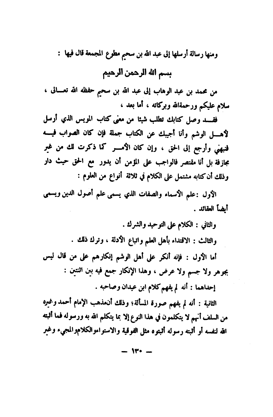 -3- الرسالة العشرون: ومنها رسالة أرسلها إلى عبد الله بن سحيم، مطوع المجمعة، قال فيها:
