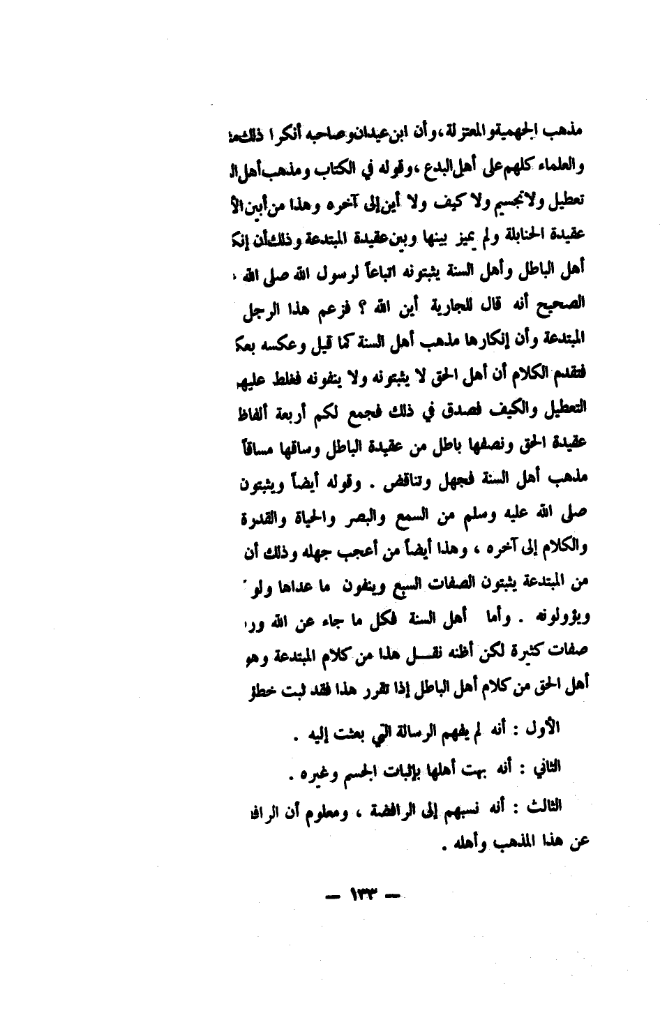 وأما الجسم، فتقدم الكلام أن أهل الحق لا يثبتونه ولا ينفونه، فغلط عليهم في إثباته. وأما التعطيل والكيف فصدق في ذلك؛ فجمع لكم أربعة ألفاظ: نصفها حق من عقيدة الحق، ونصفها باطل من عقيدة الباطل، وساقها مساقاً واحداً، وزعم أنه مذهب أهل السنة، فجهل وتناقض. وقوله أيضاً: ويثبتون ما أثبته الرسول صلى الله عليه وسلم من السمع والبصر والحياة والقدرة والإرادة والعلم والكلام ... إلخ، وهذا أيضاً من أعجب جهله؛ وذلك أن هذا مذهب طائفة من المبتدعة يثبتون الصفات السبع، وينفون ما عداها ولو كان في كتاب الله، ويؤولونه. وأما أهل السنة، فكل ما جاء عن الله ورسوله أثبتوه، وذلك صفات كثيرة؛ لكن أظنه نقل هذا من كلام المبتدعة وهو لا يميز بين كلام أهل الحق من كلام أهل الباطل.