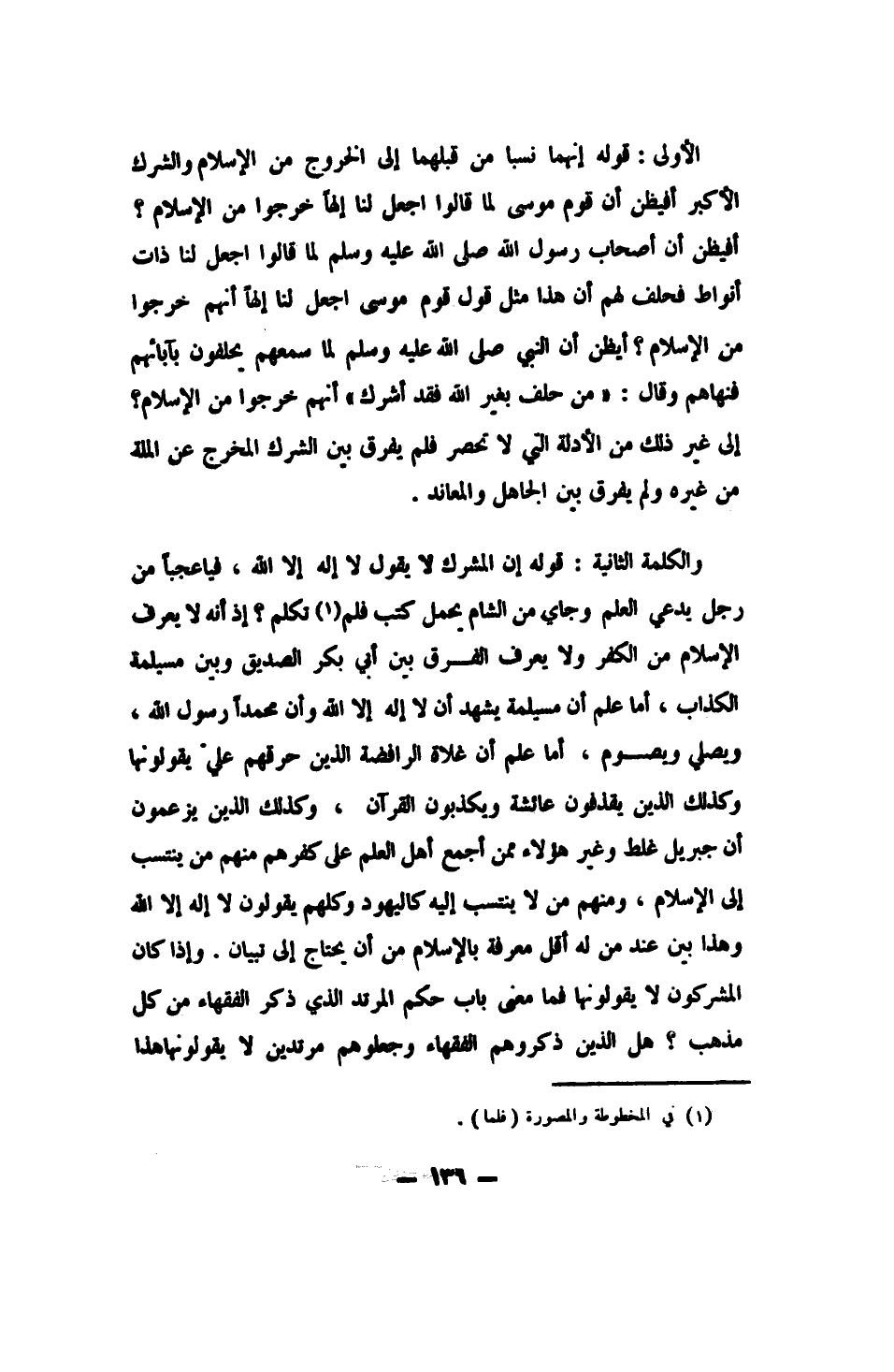 الأولى: قوله: إنهما نسبا من قبلهما إلى الخروج من الإسلام والشرك الأكبر، أفيظن أن قوم موسى لما قالوا: اجعل لنا إلها، خرجوا من الإسلام؟ أفيظن أن أصحاب رسول الله صلى الله عليه وسلم لما قالوا: اجعل لنا ذات أنواط، فحلف لهم أن هذا مثل قول قوم موسى: اجعل لنا إلهاً، أنهم خرجوا من الإسلام؟ أيظن أن النبي صلى الله عليه وسلم لما سمعهم يحلفون بآبائهم فنهاهم، وقال: " من حلف بغير الله فقد أشرك " 1، أنهم خرجوا من الإسلام؟ إلى غير ذلك من الأدلة التي لا تحصر؛ فلم يفرق بين الشرك المخرج عن الملة من غيره، ولم يفرق بين الجاهل والمعاند.