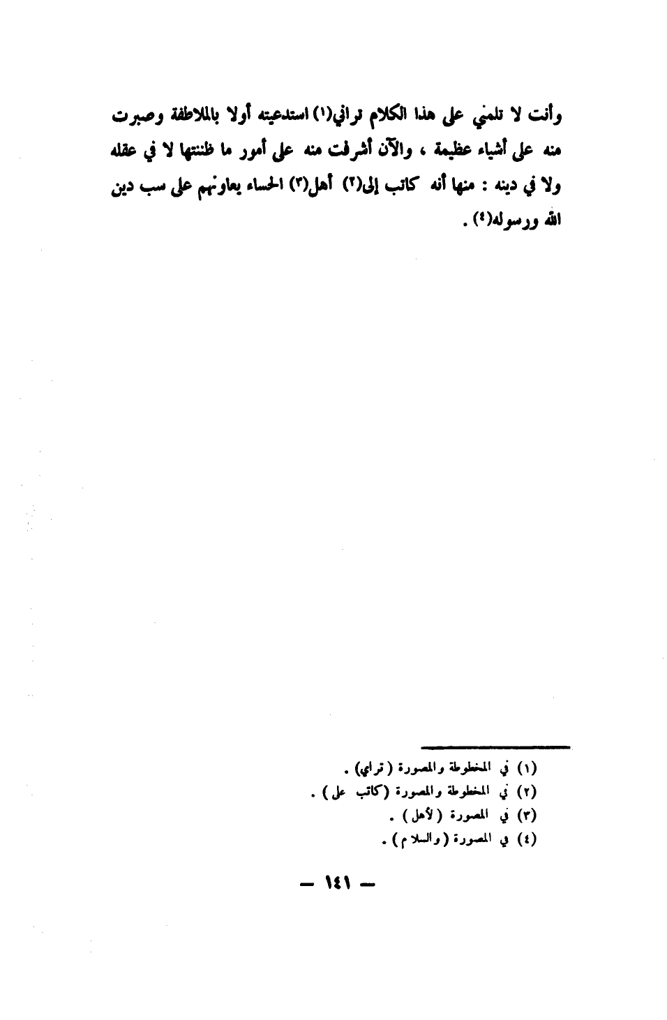 وأنت لا تلمني على هذا الكلام؛ تراني 1 استدعيته أولاً بالملاطفة، وصبرت منه على أشياء عظيمة، والآن أشرفت منه على أمور ما ظننتها لا في عقله ولا في دينه. منها: أنه كاتب إلى 2 أهل 3 الحساء يعاونهم على سب دين الله ورسوله 4.