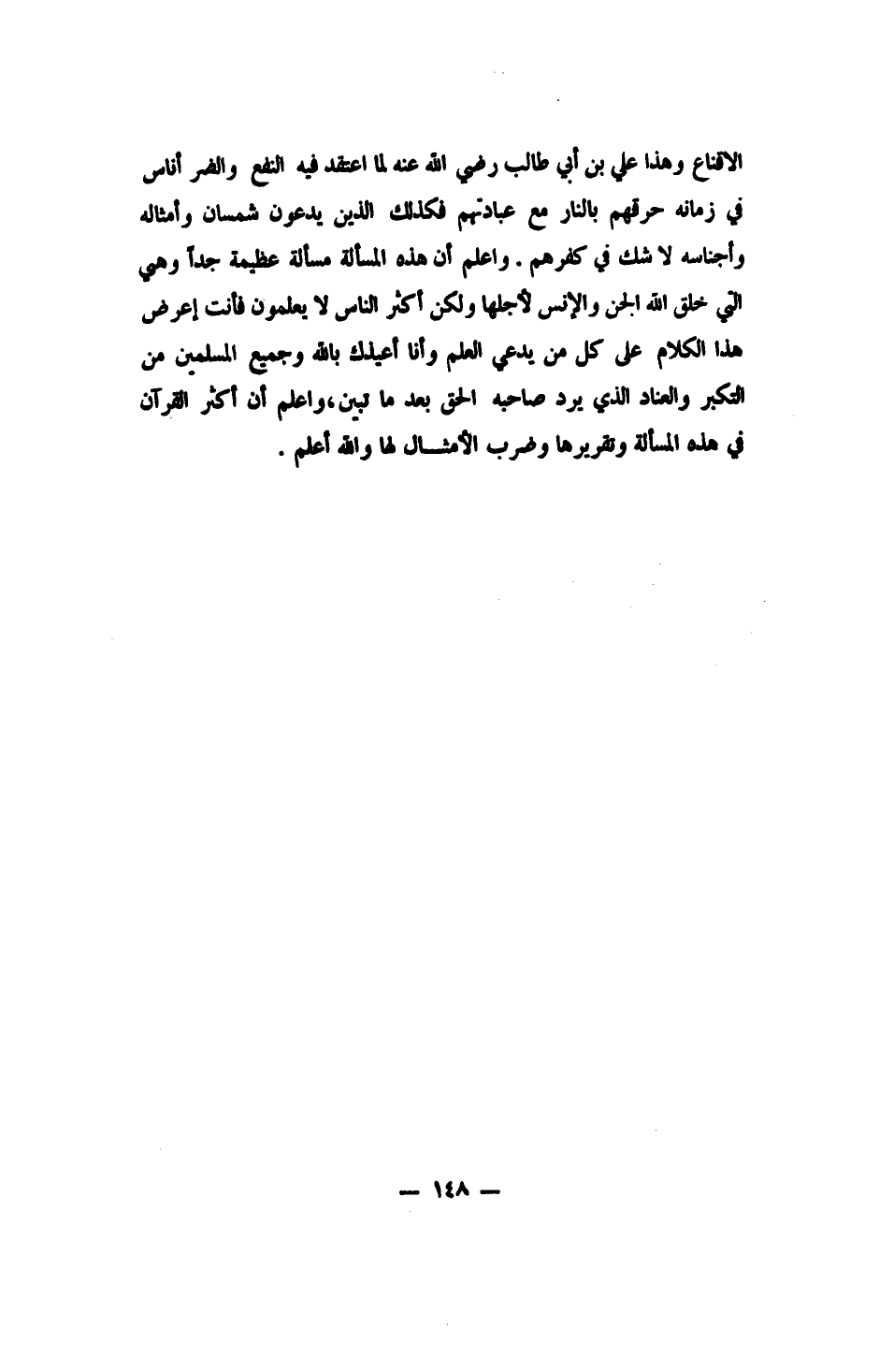 واعلم أن هذه المسألة مسألة عظيمة جداً، وهي التي خلق الله الجن والإنس لأجلها، ولكن أكثر الناس لا يعلمون. فأنت، اعرضْ هذا الكلام على كل من يدعي العلم، وأنا أعيذك بالله وجميع المسلمين من التكبر والعناد، الذي يرد صاحبه الحق بعد ما تبين. واعلم أن أكثر القرآن في هذه المسألة وتقريرها، وضرب الأمثال لها، والله أعلم.