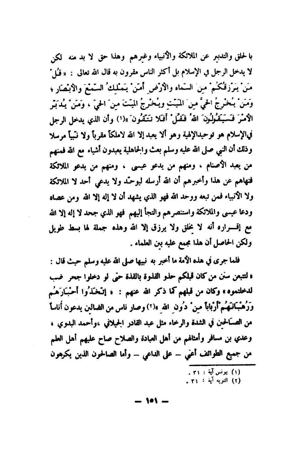 فلما جرى في هذه الأمة ما أخبر به نبيها صلى الله عليه وسلم حيث قال: " لتتبعنّ سنن من كان قبلكم، حذو القذة بالقذة، حتى لو دخلوا جحر ضب لدخلتموه " 2. وكان من قبلهم كما ذكر الله عنهم: {اتَّخَذُوا أَحْبَارَهُمْ وَرُهْبَانَهُمْ أَرْبَاباً مِنْ دُونِ اللَّهِ} 3، وصار ناس من الضالين يدعون أناساً من الصالحين في الشدة والرخاء، مثل عبد القادر الجيلاني، وأحمد البدوي، وعدي بن مسافر، وأمثالهم من أهل العبادة والصلاح، صاح عليهم أهل العلم من جميع الطوائف - أعني: على الداعي –. وأما الصالحون الذين يكرهون