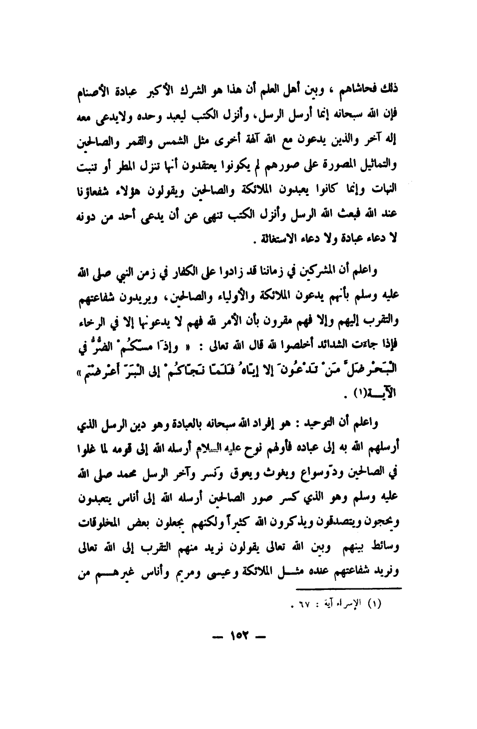 واعلم أن التوحيد: هو إفراد الله سبحانه بالعبادة، وهو دين الرسل الذي أرسلهم الله به إلى عباده. فأولهم نوح، عليه السلام، أرسله الله إلى قومه لما غلوا في الصالحين: ودّ وسواع ويغوث ويعوق ونسر. وآخر الرسل محمد صلى الله عليه وسلم، وهو الذي كسر صور الصالحين، أرسله الله إلى أناس يتعبدون ويحجون ويتصدقون ويذكرون الله كثيراً، ولكنهم يجعلون بعض المخلوقات وسائط بينهم وبين الله تعالى، يقولون: نريد منهم التقرب إلى الله تعالى، ونريد شفاعتهم عنده، مثل الملائكة وعيسى ومريم وأناس غيرهم من