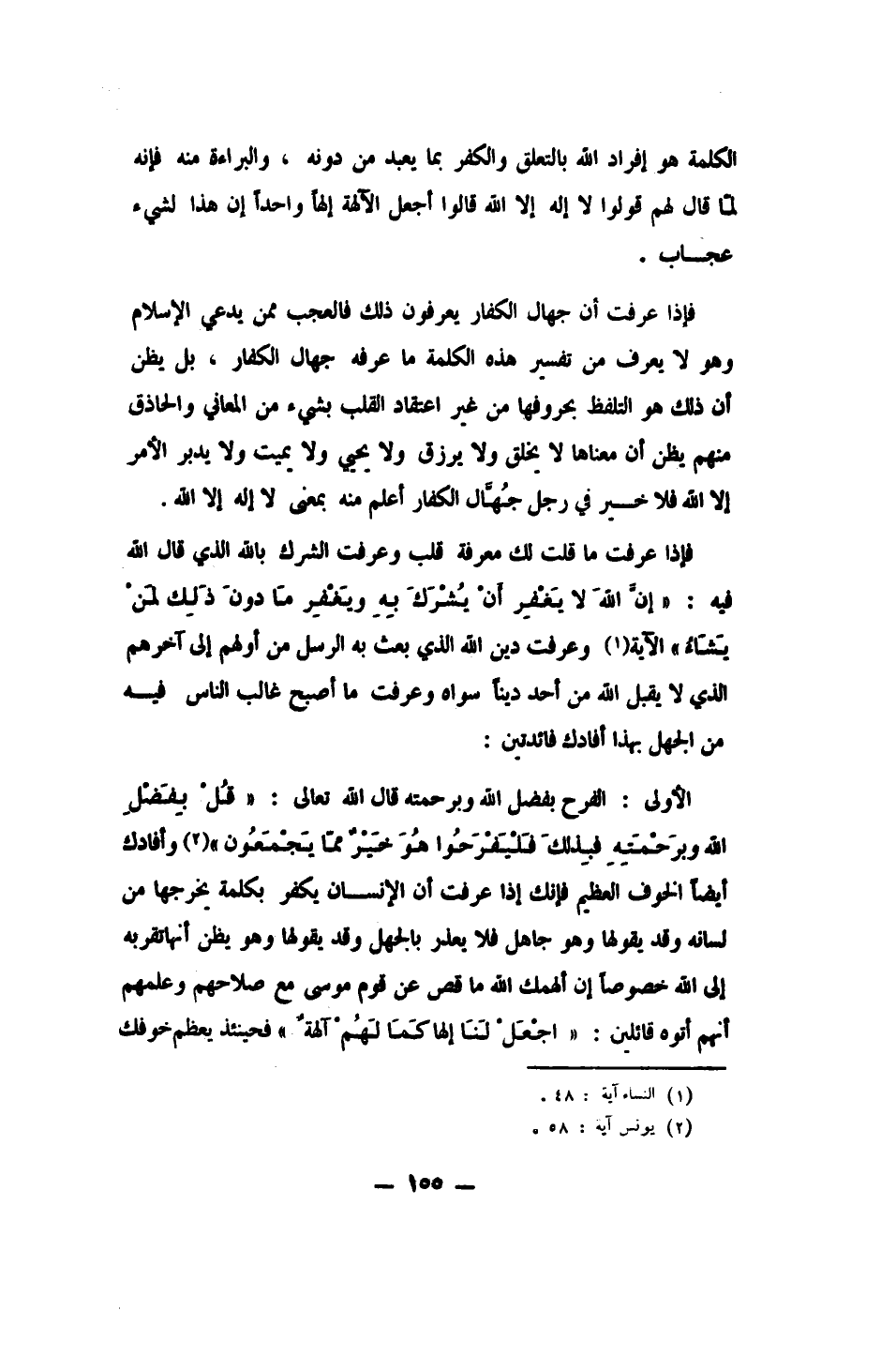 فإذا عرفت ما قلت لك معرفة قلب، وعرفت الشرك بالله الذي قال الله فيه: {إِنَّ اللَّهَ لا يَغْفِرُ أَنْ يُشْرَكَ بِهِ وَيَغْفِرُ مَا دُونَ ذَلِكَ لِمَنْ يَشَاءُ} 1 الآية، وعرفت دين الله الذي بعث به الرسل من أولهم إلى آخرهم، الذي لا يقبل الله من أحد ديناً سواه، وعرفت ما أصبح غالب الناس فيه من الجهل بهذا، أفادك فائدتين: