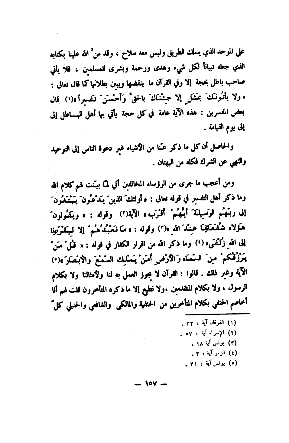 ومن أعجب ما جرى من الرؤساء المخالفين، أني لمّا بينت لهم كلام الله، وما ذكر أهل التفسير في قوله تعالى: {أُولَئِكَ الَّذِينَ يَدْعُونَ يَبْتَغُونَ إِلَى رَبِّهِمُ الْوَسِيلَةَ أَيُّهُمْ أَقْرَبُ} 2 الآية، وقوله: {وَيَقُولُونَ هَؤُلاءِ شُفَعَاؤُنَا عِنْدَ اللَّهِ} 3، وقوله: {مَا نَعْبُدُهُمْ إِلاَّ لِيُقَرِّبُونَا إِلَى اللَّهِ زُلْفَى} 4، وما ذكر الله من إقرار الكفار في قوله: {قُلْ مَنْ يَرْزُقُكُمْ مِنَ السَّمَاءِ وَالأَرْضِ أَمَّنْ يَمْلِكُ السَّمْعَ وَالأَبْصَارَ} 5 الآية، وغير ذلك، قالوا: القرآن لا يجوز العمل به لنا ولأمثالنا، ولا بكلام الرسول، ولا بكلام المتقدمين، ولا نطيع إلا ما ذكره المتأخرون. قلت لهم: أنا أخاصم الحنفي بكلام المتأخرين من الحنفية، والمالكي، والشافعي، والحنبلي، كلٌ