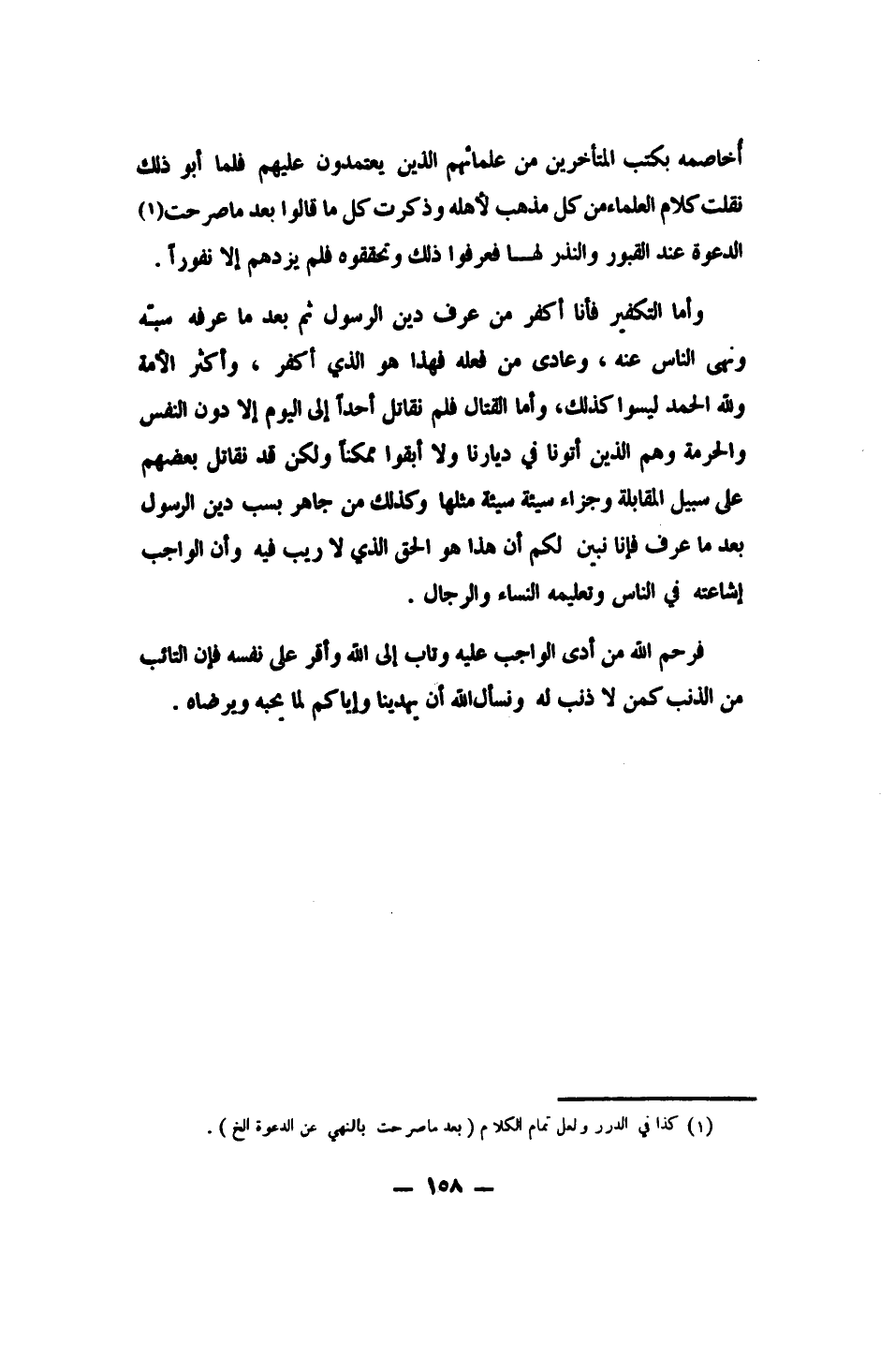 وأما القتال، فلم نقاتل أحداً إلى اليوم إلا دون النفس والحرمة. وهم الذين أتونا في ديارنا، ولا أبقوا ممكناً، ولكن قد نقاتل بعضهم على سبيل المقابلة،: {وَجَزَاءُ سَيِّئَةٍ سَيِّئَةٌ مِثْلُهَا} 2، وكذلك من جاهر بسب دين الرسول بعد ما عرف. فإنا نبين لكم أن هذا هو الحق الذي لا ريب فيه، وأن الواجب إشاعته في الناس وتعليمه النساء والرجال.
