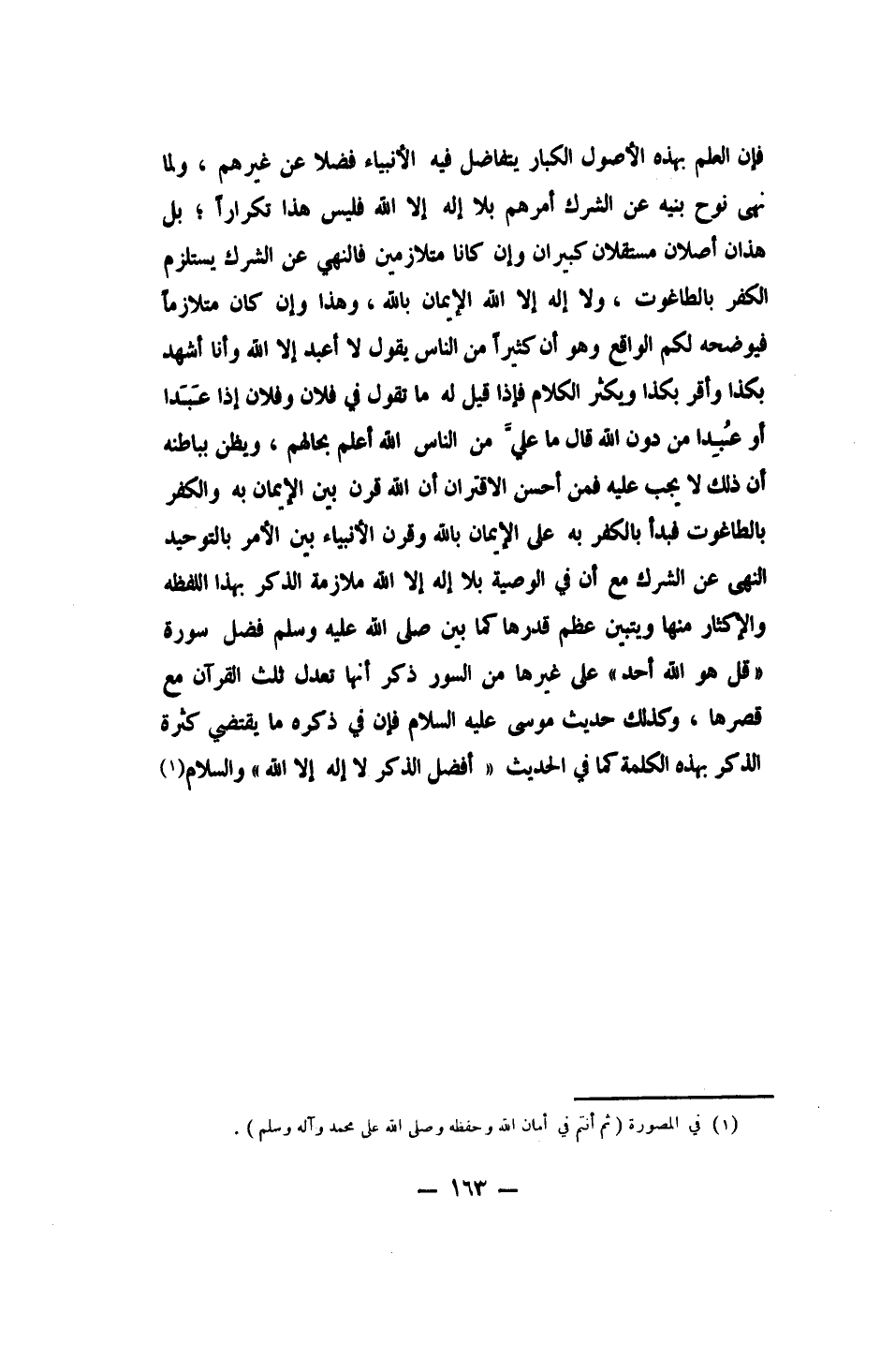 فإن العلم بهذه الأصول الكبار يتفاضل فيه الأنبياء فضلاً عن غيرهم، ولما نهى نوح بنيه عن الشرك أمرهم بلا إله إلا الله؛ فليس هذا تكراراً، بل هذان أصلان مستقلان كبيران، وإن كانا متلازمين. فالنهي عن الشرك يستلزم الكفر بالطاغوت، ولا إله إلا الله الإيمان بالله، وهذا وإن كان متلازماً فيوضحه لكم الواقع، وهو أن كثيراً من الناس يقول: لا أعبد إلا الله، وأنا أشهد بكذا، وأقر بكذا، ويكثر الكلام، فإذا قيل له: ما تقول في فلان وفلان إذا عَبَدا أو عُبِدا من دون الله، قال: ما عليَّ من الناس، الله أعلم بحالهم، ويظن بباطنه أن ذلك لا يجب عليه.