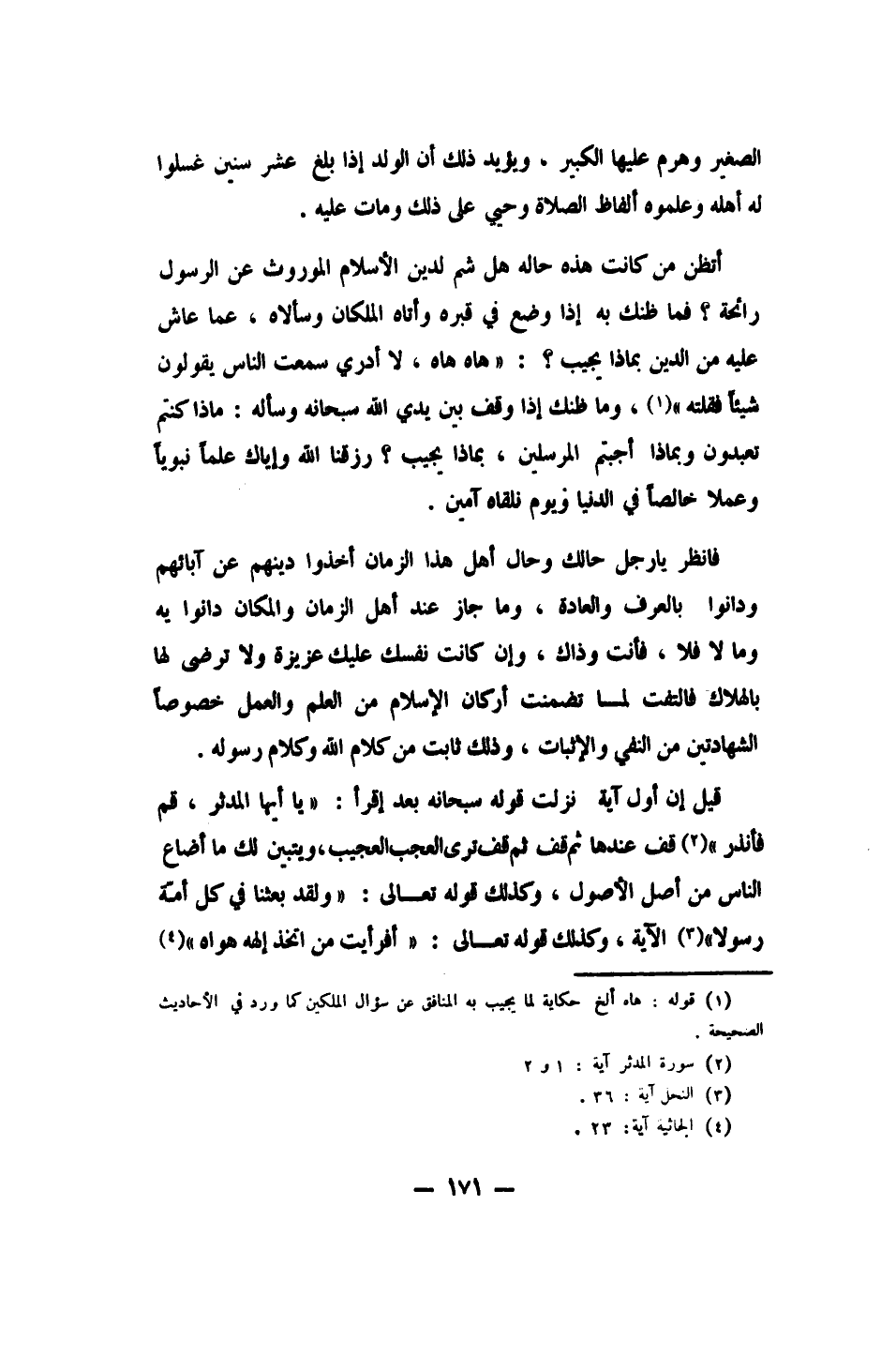أتظن من كانت هذه حاله، هل شم لدين الإسلام الموروث عن الرسول رائحة؟ فما ظنك به إذا وضع في قبره وأتاه الملكان وسألاه عما عاش عليه من الدين، بماذا يجيب؟ " هاه! هاه! لا أدري. سمعت الناس يقولون شيئا فقلتُه " 1. وما ظنك إذا وقف بين يدي الله سبحانه، وسأله: ماذا كنتم تعبدون؟ وبماذا أجبتم المرسلين؟ بماذا يجيب؟ رزقنا الله وإياك علماً نبوياً وعملاً خالصاً في الدنيا ويوم نلقاه. آمين.