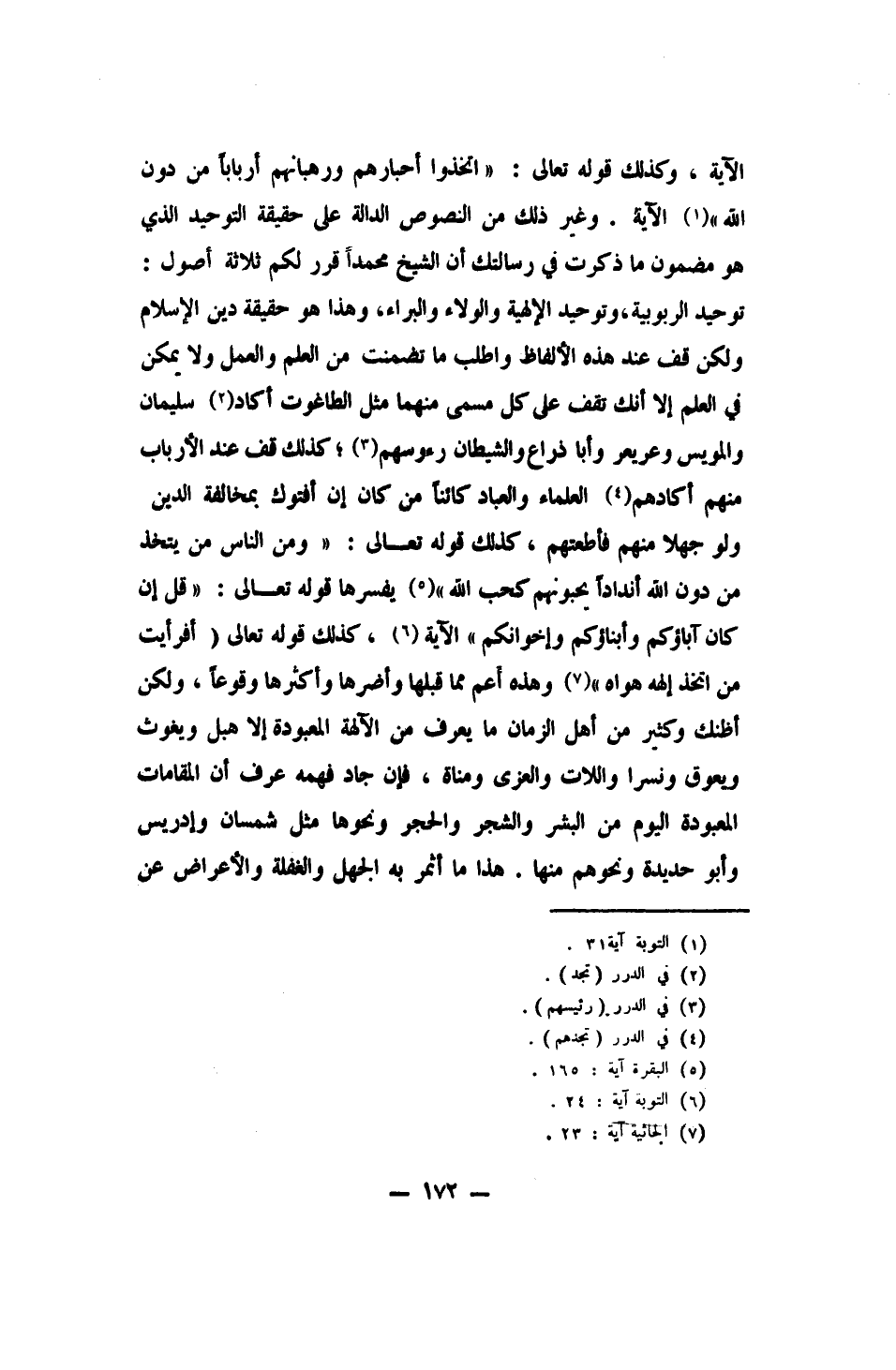 الآية، وكذلك قوله تعالى: {اتَّخَذُوا أَحْبَارَهُمْ وَرُهْبَانَهُمْ أَرْبَاباً مِنْ دُونِ اللَّهِ} 1 الآية، وغير ذلك من النصوص الدالة على حقيقة التوحيد، الذي هو مضمون ما ذكرت في رسالتك، أن الشيخ محمداً قرر لكم ثلاثة أصول: توحيد الربوبية، وتوحيد الإلهية، والولاء والبراء؛ وهذا هو حقيقة دين الإسلام. ولكن قف عند هذه الألفاظ، واطلب ما تضمنت من العلم والعمل، ولا يمكن في العلم إلا أنك تقف على كل مسمى منهما مثل الطاغوت، أكاد 2 سليمان والمويس وعريعر وأبا ذراع والشيطان رؤوسهم 3. كذلك قف عند الأرباب منهم، أكادهم 4 العلماء والعباد كائناً من كان، إن أفتوك بمخالفة الدين ولو جهلاً منهم فأطعتهم. كذلك قوله تعالى: {وَمِنَ النَّاسِ مَنْ يَتَّخِذُ مِنْ دُونِ اللَّهِ أَنْدَاداً يُحِبُّونَهُمْ كَحُبِّ اللَّهِ} 5، يفسرها قوله تعالى: {قُلْ إِنْ كَانَ آبَاؤُكُمْ وَأَبْنَاؤُكُمْ وَإِخْوَانُكُمْ} 6 الآية. كذلك قوله تعالى: {أَفَرَأَيْتَ مَنِ اتَّخَذَ إِلَهَهُ هَوَاهُ} 7، وهذه أعم مما قبلها، وأضرها، وأكثرها وقوعاً، ولكن أظنك وكثير من أهل الزمان ما يعرف من الآلهة المعبودة إلا هبل ويغوث ويعوق ونسراً واللات والعزى ومناة. فإن جاد فهمه عرف أن المقامات المعبودة اليوم من البشر والشجر والحجر ونحوها مثل شمسان وإدريس وأبو حديدة ونحوهم، منها.
