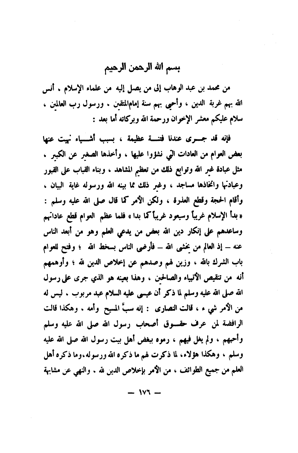 من محمد بن عبد الوهاب، إلى من يصل إليه من علماء الإسلام، أنس الله بهم غربة الدين، وأحيا بهم سنة إمام المتقين، ورسول رب العالمين؛ سلام عليكم معشر الإخوان، ورحمة الله وبركاته.