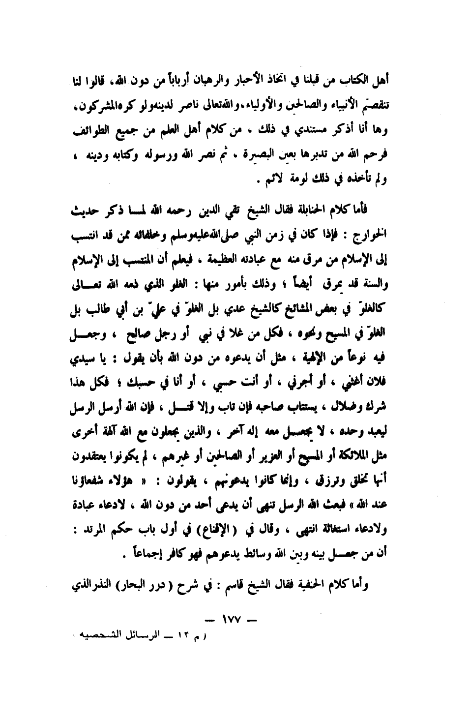 فأما كلام الحنابلة: فقال الشيخ تقي الدين، رحمه الله، لما ذكر حديث الخوارج: فإذا كان في زمن النبي صلى الله عليه وسلم وخلفائه ممن قد انتسب إلى الإسلام من مرق منه مع عبادته العظيمة، فيعلم أن المنتسب إلى الإسلام والسنة قد يمرق أيضاً، وذلك بأمور، منها: الغلو الذي ذمه الله تعالى، كالغلوّ في بعض المشايخ كالشيخ عدي، بل الغلوّ في عليّ بن أبي طالب، بل الغلوّ في المسيح ونحوه. فكل من غلا في نبي أو رجل صالح، وجعل فيه نوعاً من الإلهية، مثل أن يدعوه من دون الله بأن يقول: يا سيدي فلان أغثني! أو أجرني! أو أنت حسبي، أو أنا في حسبك، فكل هذا شرك وضلال، يستتاب صاحبه، فإن تاب وإلا قتل. فإن الله أرسل الرسل ليعبد وحده، لا يجعل معه إله آخر.