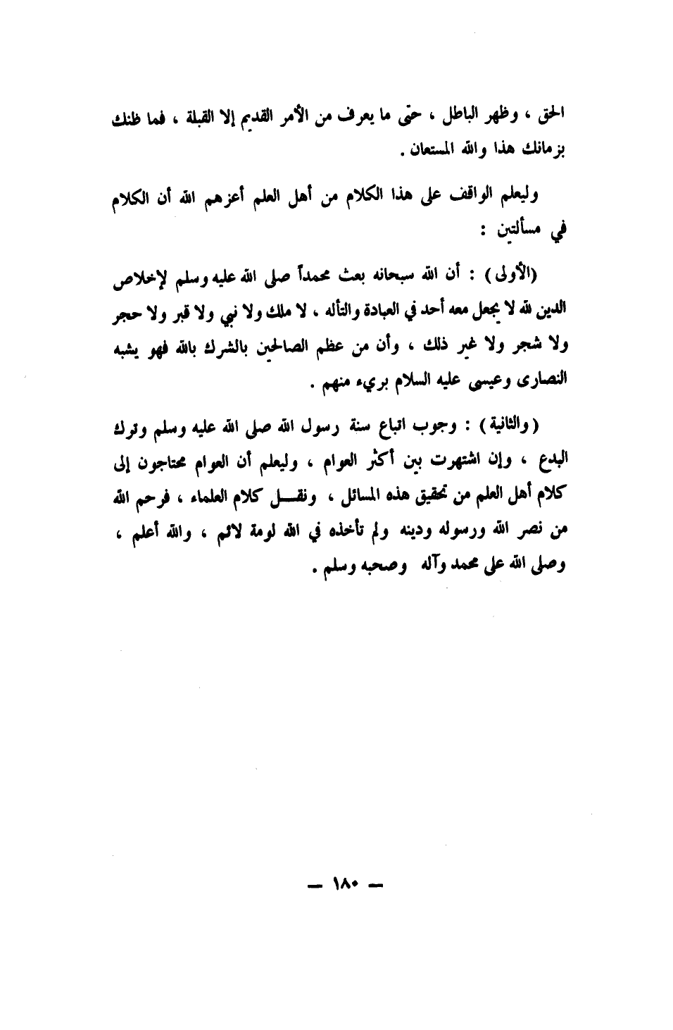 والثانية: وجوب اتباع سنة رسول الله صلى الله عليه وسلم، وترك البدع، وإن اشتهرت بين أكثر العوام؛ وليعلم أن العوام محتاجون إلى كلام أهل العلم من تحقيق هذه المسائل، ونقل كلام العلماء. فرحم الله من نصر الله ورسوله ودينه، ولم تأخذه في الله لومة لائم. والله أعلم، وصلى الله على محمد وآله وصحبه وسلم.