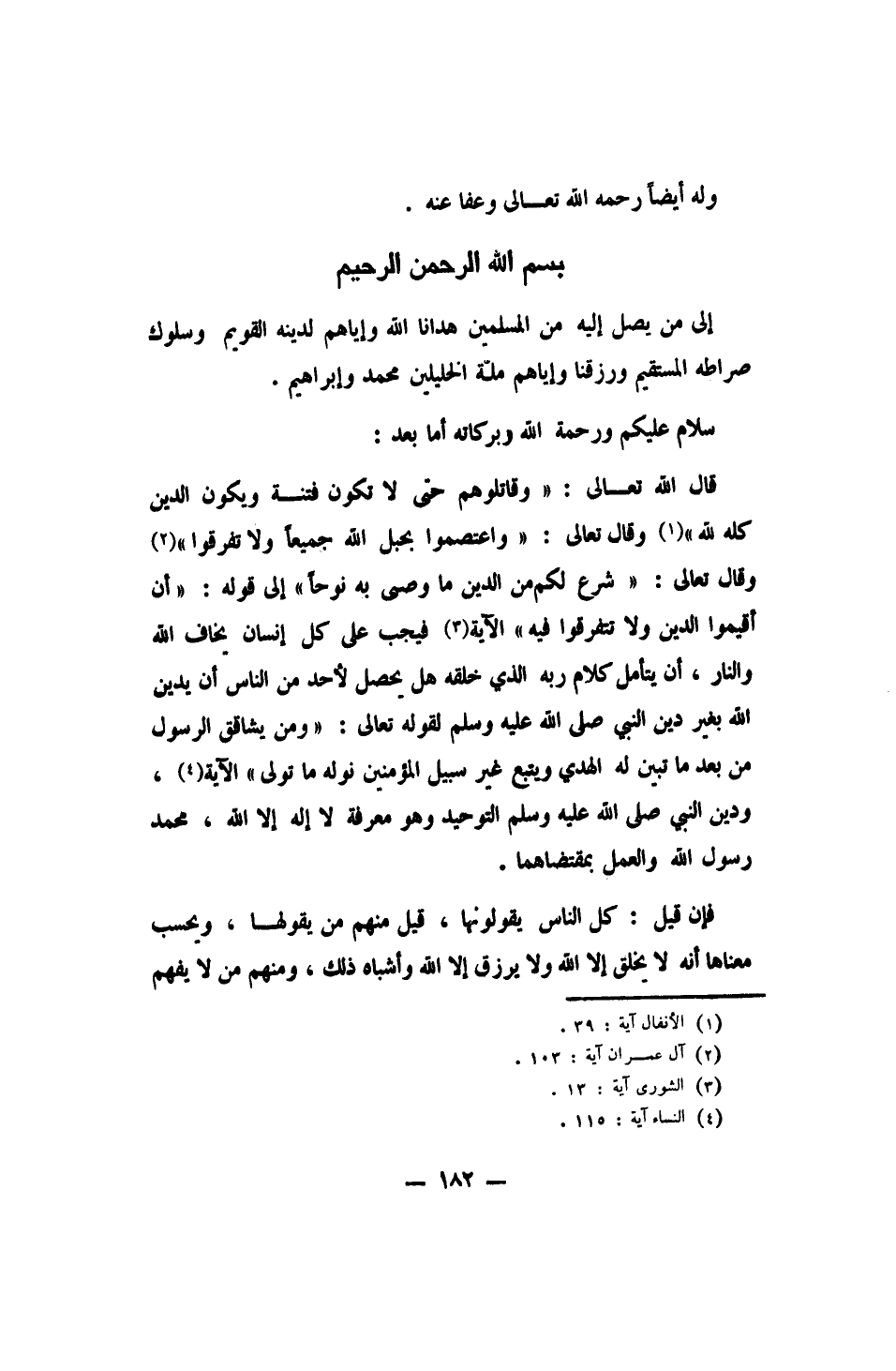 أما بعد، قال الله تعالى: {وَقَاتِلُوهُمْ حَتَّى لا تَكُونَ فِتْنَةٌ وَيَكُونَ الدِّينُ لِلَّهِ} 1، وقال تعالى: {وَاعْتَصِمُوا بِحَبْلِ اللَّهِ جَمِيعاً وَلا تَفَرَّقُوا} 2، وقال تعالى: {شَرَعَ لَكُمْ مِنَ الدِّينِ مَا وَصَّى بِهِ نُوحاً} 3 إلى قوله: {أَنْ أَقِيمُوا الدِّينَ وَلا تَتَفَرَّقُوا فِيهِ} 4 الآية؛ فيجب على كل إنسان يخاف الله والنار، أن يتأمل كلام ربه الذي خلقه. هل يحصل لأحد من الناس أن يدين الله بغير دين النبي صلى الله عليه وسلم؟ لقوله تعالى: {وَمَنْ يُشَاقِقِ الرَّسُولَ مِنْ بَعْدِ مَا تَبَيَّنَ لَهُ الْهُدَى وَيَتَّبِعْ غَيْرَ سَبِيلِ الْمُؤْمِنِينَ نُوَلِّهِ مَا تَوَلَّى} 5 الآية، ودين النبي صلى الله عليه وسلم: التوحيد، وهو معرفة لا إله إلا الله، محمد رسول الله، والعمل بمقتضاهما.