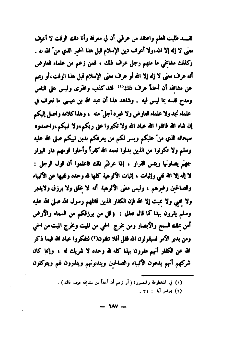 لقد طلبت العلم، واعتقدَ من عرفني أن لي معرفة، وأنا ذلك الوقت لا أعرف معنى "لا إله إلا الله"، ولا أعرف دين الإسلام قبل هذا الخير الذي مَنَّ الله به، وكذلك مشايخي، ما منهم رجل عرف ذلك. فمن زعم من علماء العارض أنه عرف معنى "لا اله إلا الله"، أو عرف معنى الإسلام قبل هذا الوقت، أو زعم عن مشايخه أن أحداً عرف ذلك 1، فقد كذب وافترى، ولبس على الناس، ومدح نفسه بما ليس فيه. وشاهد هذا أن عبد الله بن عيسى ما نعرف في علماء نجد ولا علماء العارض ولا غيره أجلّ منه، وهذا كلامه واصل إليكم إن شاء الله.