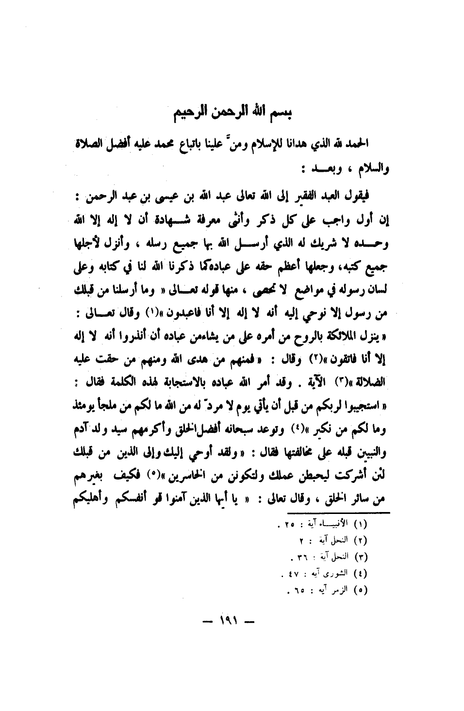 وبعد، فيقول العبد الفقير إلى الله تعالى: عبد الله بن عيسى بن عبد الرحمن: إن أول واجب على كل ذكر وأنثى: معرفة شهادة أن لا إله إلا الله وحده لا شريك ل، هـ الذي أرسل الله بها جميع رسله، وأنزل لأجلها جميع كتبه، وجعلها أعظم حقه على عباده، كما ذكر الله لنا في كتابه، وعلى لسان رسوله في مواضع لا تحصى، منها قوله تعالى: {وَمَا أَرْسَلْنَا مِنْ قَبْلِكَ مِنْ رَسُولٍ إِلَّا نُوحِي إِلَيْهِ أَنَّهُ لا إِلَهَ إِلَّا أَنَا فَاعْبُدُونِ} 1، وقال تعالى: {يُنَزِّلُ الْمَلائِكَةَ بِالرُّوحِ مِنْ أَمْرِهِ عَلَى مَنْ يَشَاءُ مِنْ عِبَادِهِ أَنْ أَنْذِرُوا أَنَّهُ لا إِلَهَ إِلَّا أَنَا فَاتَّقُونِ} 2، وقال: {فَمِنْهُمْ مَنْ هَدَى اللَّهُ وَمِنْهُمْ مَنْ حَقَّتْ عَلَيْهِ الضَّلالَةُ} 3 الآية.