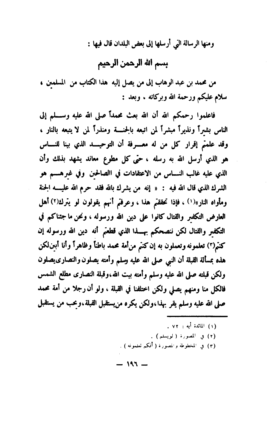 من محمد بن عبد الوهاب، إلى من يصل إليه هذا الكتاب من المسلمين،