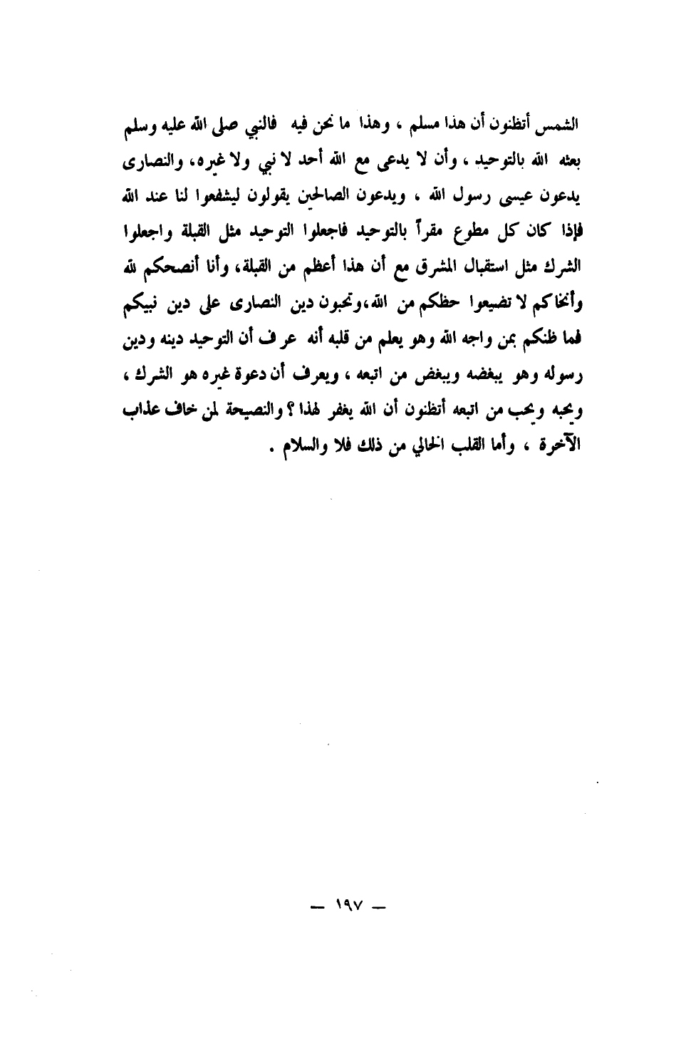 الشمس، أتظنون أن هذا مسلم؟ وهذا ما نحن فيه. فالنبي صلى الله عليه وسلم بعثه الله بالتوحيد، وأن لا يدعى مع الله أحد، لا نبي ولا غيره، والنصارى يدعون عيسى رسول الله، ويدعون الصالحين يقولون: ليشفعوا لنا عند الله، فإذا كان كل مطوع مقراً بالتوحيد، فاجعلوا التوحيد مثل القبلة، واجعلوا الشرك مثل استقبال المشرق، مع أن هذا أعظم من القبلة. وأنا أنصحكم لله، وأنخاكم لا تضيعوا حظكم من الله، وتحبون دين النصارى على دين نبيكم. فما ظنكم بمن واجه الله وهو يعلم من قلبه أنه عرف أن التوحيد دينه ودين رسوله، وهو يبغضه ويبغض من اتبعه، ويعرف أن دعوة غيره هو الشرك، ويحبه ويحب من اتبعه، أتظنون أن الله يغفر لهذا؟ والنصيحة لمن خاف عذاب الآخرة، وأما القلب الخالي من ذلك فلا. والسلام.