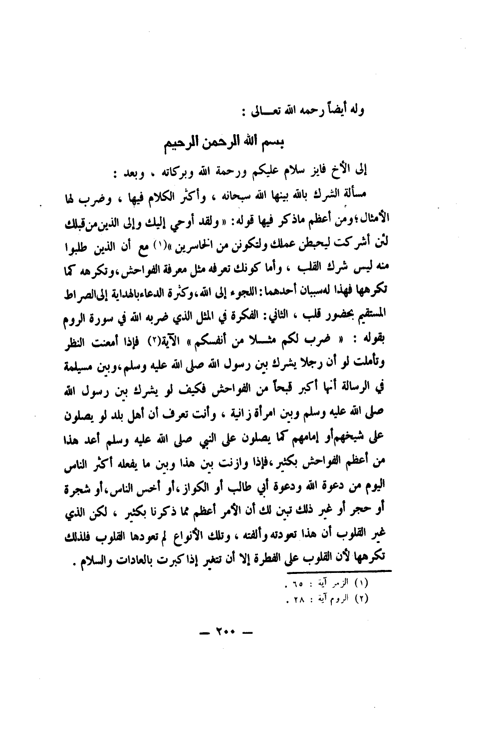 وبعد، مسألة الشرك بالله بيّنها الله سبحانه، وأكثر الكلام فيها، وضرب لها الأمثال; ومن أعظم ما ذكر فيها قوله: {وَلَقَدْ أُوحِيَ إِلَيْكَ وَإِلَى الَّذِينَ مِنْ قَبْلِكَ لَئِنْ أَشْرَكْتَ لَيَحْبَطَنَّ عَمَلُكَ وَلَتَكُونَنَّ مِنَ الْخَاسِرِينَ} 1، مع أن الذين طلبوا منه ليس شرك القلب. وأما كونك تعرفه مثل معرفة الفواحش، وتكرهه كما تكرهها، فهذا له سببان: أحدهما: اللجوء إلى الله، وكثرة الدعاء بالهداية إلى الصراط المستقيم بحضور قلب. الثاني: الفكرة في المثل الذي ضربه الله في سورة الروم بقوله: {ضَرَبَ لَكُمْ مَثَلاً مِنْ أَنْفُسِكُمْ} 2 الآية. فإذا أمعنت النظر وتأملت، لو أن رجلاً يشرك بين رسول الله صلى الله عليه وسلم وبين مسيلمة في الرسالة، أنها أكبر قبحاً من الفواحش، فكيف لو يشرك بين رسول الله صلى الله عليه وسلم وبين امرأة زانية؟ وأنت تعرف أن أهل بلد لو يصلون على شيخهم أو إمامهم كما يصلون على النبي صلى الله عليه وسلم، عد هذا من أعظم الفواحش بكثير. فإذا وازنت بين هذا وبين ما يفعله أكثر الناس اليوم من دعوة الله ودعوة أبي طالب أو الكواز، أو أخس الناس، أو شجرة أو حجر أو غير ذلك، تبين لك أن الأمر أعظم مما ذكرنا بكثير. لكن الذي غير القلوب، أن هذا تعودته وألفته، وتلك الأنواع لم تعودها القلوب، فلذلك تكرهها، لأن القلوب على الفطرة إلا أن تتغير إذا كبرت بالعادات. والسلام.