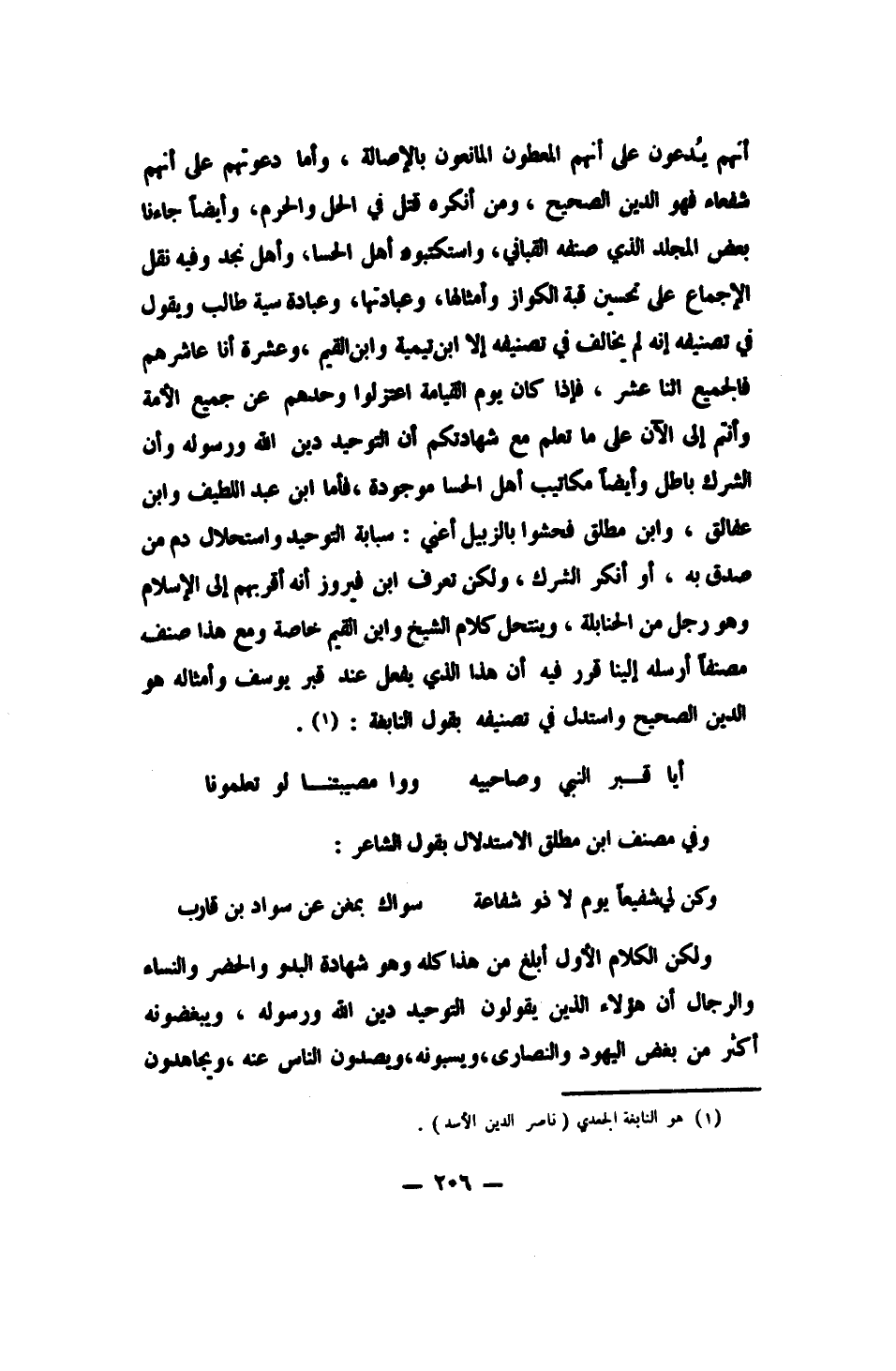 وأيضاً، جاءنا بعض المجلد الذي صنفه القباني، واستكتبوه أهل الحسا وأهل نجد، وفيه نقل الإجماع على تحسين قبة الكواز وأمثالها، وعبادتها، وعبادة سية طالب، ويقول في تصنيفه: إنه لم يخالف في تصنيفه إلا ابن تيمية وابن القيم، وعشرة أنا عاشرهم، فالجميع اثنا عشر، فإذا كان يوم القيامة، اعتزلوا وحدهم عن جميع الأمة. وأنتم إلى الآن على ما تعلم، مع شهادتكم أن التوحيد دين الله ورسوله، وأن الشرك باطل، وأيضاً مكاتيب أهل الحسا موجودة، فأما ابن عبد اللطيف وابن عفالق، وابن مطلق فحشوا بالزبيل أعني: سبابة التوحيد واستحلال دم من صدق به، أو أنكر الشرك، ولكن تعرف ابن فيروز أنه أقربهم إلى الإسلام وهو رجل من الحنابلة، وينتحل كلام الشيخ وابن القيم خاصة، ومع هذا صنف مصنفاً أرسله إلينا قرر فيه أن هذا الذي يفعل عند قبر يوسف وأمثاله هو الدين الصحيح، واستدل في تصنيفه بقول النابغة 1: