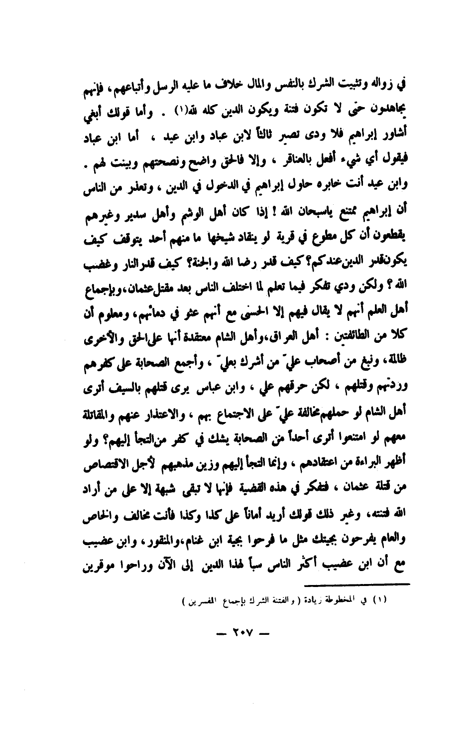 وأما قولك: أبغي أشاور إبراهيم، فلا ودي تصير ثالثاً لابن عباد وابن عيد؛ أما ابن عباد فيقول: أي شيء أفعل بالعناقر، وإلا فالحق واضح ونصحتهم وبينت لهم. وابن عيد أنت خابره، حاول إبراهيم في الدخول في الدين، وتعذر من الناس أن إبراهيم ممتنع. يا سبحان الله! إذا كان أهل الوشم وأهل سدير وغيرهم يقطعون أن كل مطوع في قرية لو ينقاد شيخها ما منهم أحد يتوقف، كيف يكون قدر الدين عندكم؟ كيف قدر رضى الله والجنة؟ كيف قدر النار وغضب الله؟ ولكن ودي تفكر فيما تعلم لما اختلف الناس بعد مقتل عثمان، وبإجماع أهل العلم أنهم لا يقال فيهم إلا الحسنى مع أنهم عثوا في دمائهم. ومعلوم أن كلاً من الطائفتين: أهل العراق وأهل الشام، معتقدة أنها على الحق والأخرى ظالمة؛ ونبغ من أصحاب علي من أشرك بعلي، وأجمع الصحابة على كفرهم وردتهم وقتلهم، لكن حرقهم علي، وابن عباس يرى قتلهم بالسيف. أترى أهل الشام لو حملهم مخالفة علي على الاجتماع بهم، والاعتذار عنهم والمقاتلة معهم لو امتنعوا، أترى أحداً من الصحابة يشك في كفر من التجأ إليهم، ولو أظهر البراءة من اعتقادهم، وإنما التجأ إليهم وزين مذهبهم لأجل الاقتصاص من قتلة عثمان؟ فتفكر في هذه القضية فإنها لا تبقى شبهة إلا على من أراد الله فتنته.
