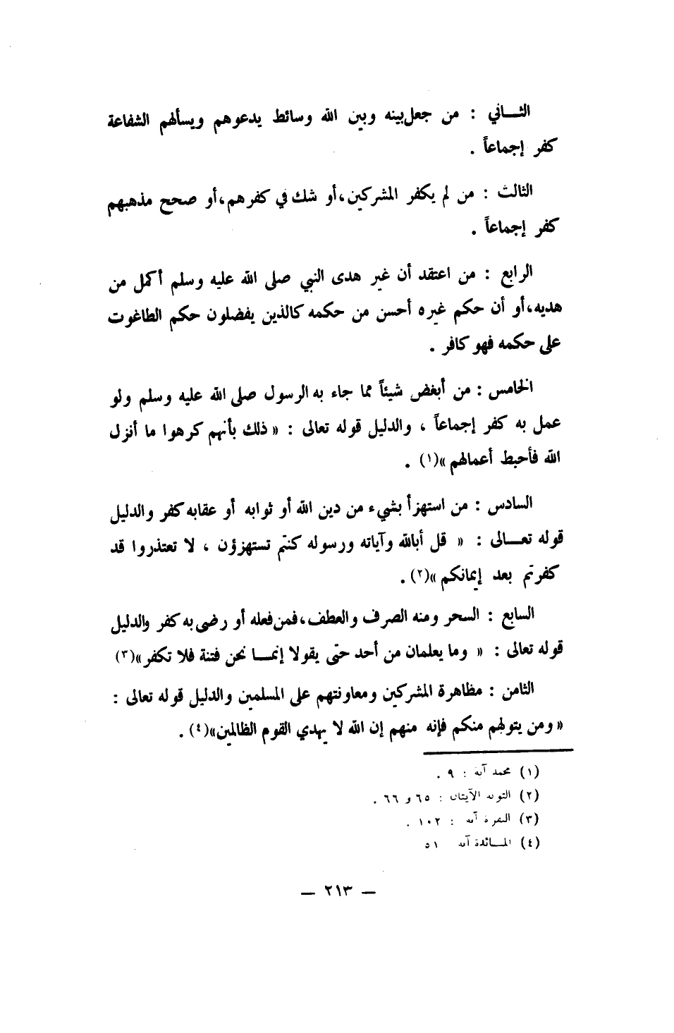 السادس: من استهزأ بشيء من دين اللهن أو ثوابه، أو عقابه، كفر، والدليل قوله تعالى: {قُلْ أَبِاللَّهِ وَآيَاتِهِ وَرَسُولِهِ كُنْتُمْ تَسْتَهْزِئُونَ لا تَعْتَذِرُوا قَدْ كَفَرْتُمْ بَعْدَ إِيمَانِكُمْ} 2.