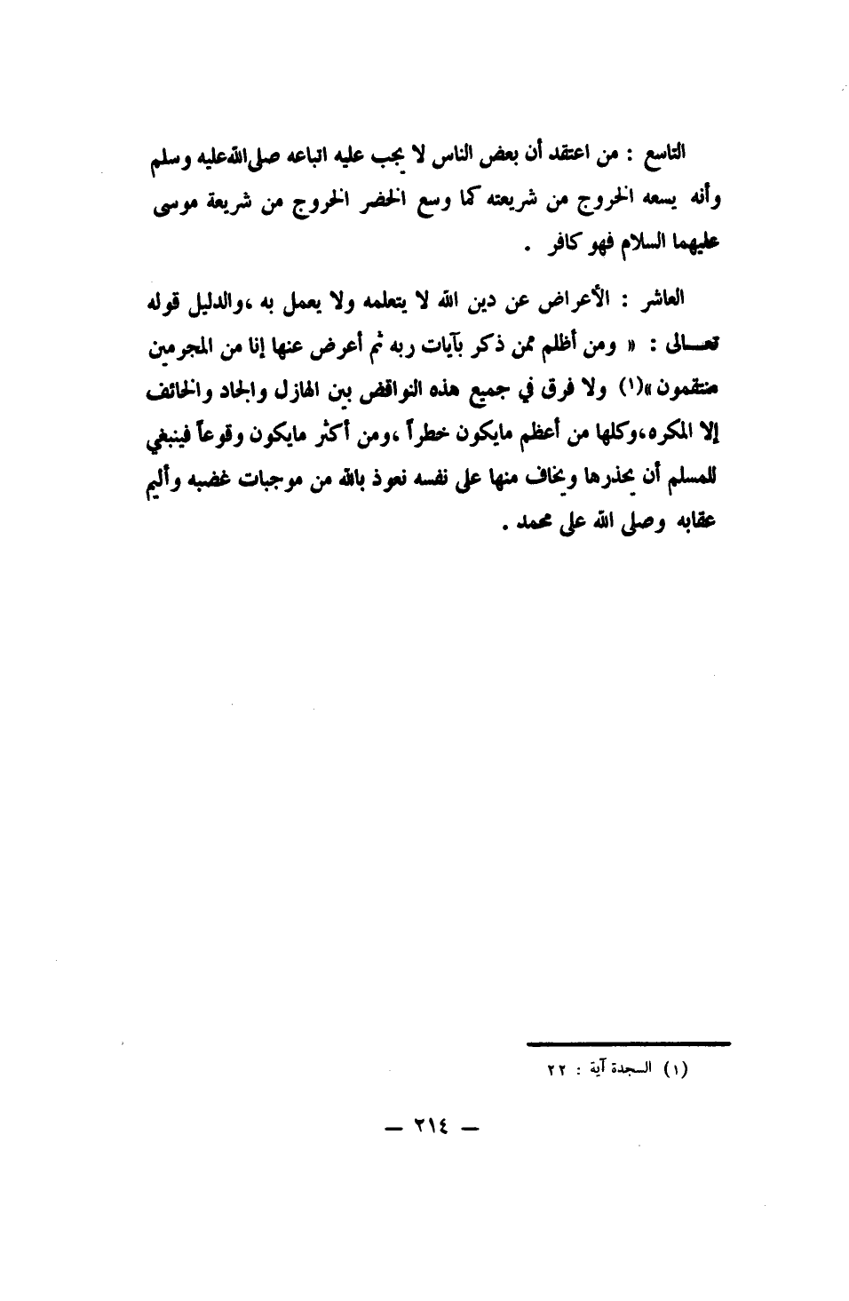 التاسع: من اعتقد أن بعض الناس لا يجب عليه اتباعه صلى الله عليه وسلم، وأنه يسعه الخروج من شريعته كما وسع الخضر الخروج من شريعة موسى، عليهما السلام، فهو كافر.