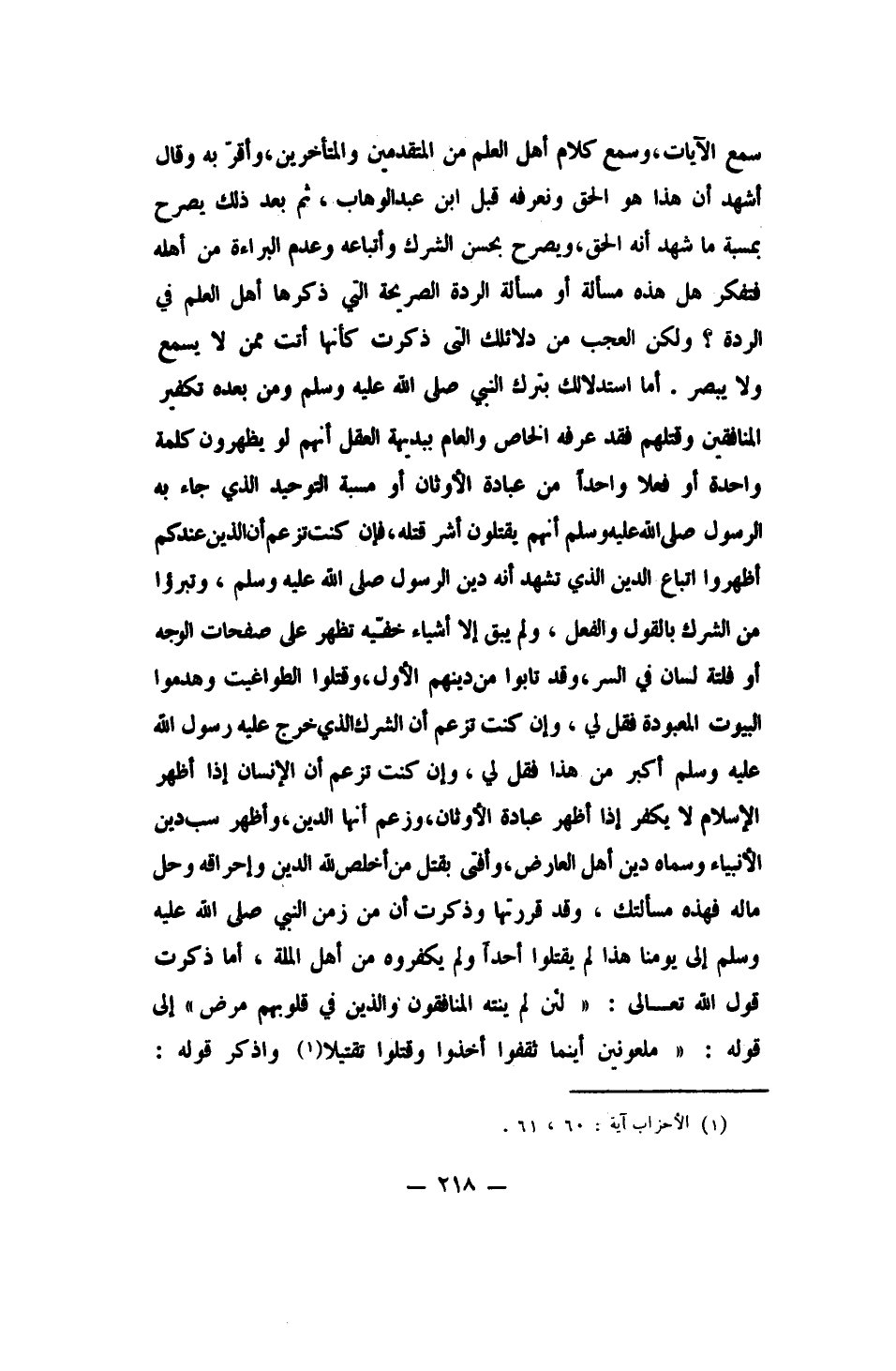 أما استدلالك بترك النبي صلى الله عليه وسلم ومَن بعده تكفير المنافقين وقتلهم، فقد عرفه الخاص والعام ببديهة العقل، أنهم لو يظهرون كلمة واحدة أو فعلاً واحداً من عبادة الأوثان أو مسبة التوحيد الذي جاء به الرسول صلى الله عليه وسلم، أنهم يُقتلون أشر قتلة. فإن كنت تزعم أن الذين عندكم أظهروا اتباع الدين الذي تشهد أنه دين الرسول صلى الله عليه وسلم، وتبرؤوا من الشرك بالقول والفعل، ولم يبق إلا أشياء خفيه تظهر على صفحات الوجه، أو فلتة لسان في السر، وقد تابوا من دينهم الأول، وقتلوا الطواغيت، وهدموا البيوت المعبودة، فقل لي. وإن كنت تزعم أن الشرك الذي خرج عليه رسول الله صلى الله عليه وسلم أكبر من هذا، فقل لي. وإن كنت تزعم أن الإنسان إذا أظهر الإسلام، لا يكفر إذا أظهر عبادة الأوثان، وزعم أنها الدين، وأظهر سب دين الأنبياء، وسماه دين أهل العارض، وأفتى بقتل من أخلص لله الدين وإحراقه وحل ماله، فهذه مسألتك، وقد قررتها وذكرت أن من زمن النبي صلى الله عليه وسلم إلى يومنا هذا لم يقتلوا أحداً، ولم يكفروه من أهل الملة. أما ذكرت قول الله تعالى: {لَئِنْ لَمْ يَنْتَهِ الْمُنَافِقُونَ وَالَّذِينَ فِي قُلُوبِهِمْ مَرَضٌ 1 إلى قوله: {مَلْعُونِينَ أَيْنَمَا ثُقِفُوا أُخِذُوا وَقُتِّلُوا تَقْتِيلاً} 2. واذكر قوله