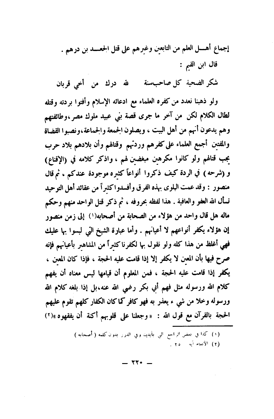 ولو ذهبنا نعدد من كفّره العلماء مع ادعائه الإسلام وأفتوا بردته وقتله لطال الكلام، لكن من آخر ما جرى: قصة بني عبيد ملوك مصر وطائفتهم، وهم يدّعون أنهم من أهل البيت، ويصلّون الجمعة والجماعة، ونصبوا القضاة والمفتين، أجمع العلماء على كفرهم وردّتهم وقتالهم، وأن بلادهم بلاد حرب، يجب قتالهم ولو كانوا مكرهين مبغضين لهم. واذكر كلامه في الإقناع وشرحه في الردة، كيف ذكروا أنواعاً كثيرة موجودة عندكم. ثم قال منصور: وقد عمت البلوى بهذه الفرق وأفسدوا كثيراً من عقائد أهل التوحيد. نسأل الله العفو والعافية. هذا لفظه بحروفه. ثم ذكر قتل الواحد منهم، وحكم ماله. هل قال واحد من هؤلاء من الصحابة من أصحابه 1 إلى زمن منصور: إن هؤلاء يكفر أنواعهم لا أعيانهم؟