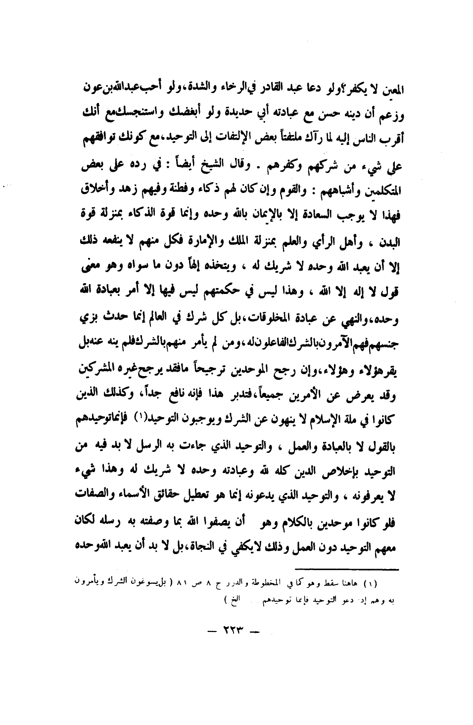 المعين لا يكفر؟ ولو دعا عبد القادر في الرخاء والشدة، ولو أحب عبد الله بن عون وزعم أن دينه حسن مع عبادته أبي حديدة، ولو أبغضك واستنجسك مع أنك أقرب الناس إليه لما رآك ملتفتاً بعض الالتفات إلى التوحيد، مع كونك توافقهم على شيء من شركهم وكفرهم.