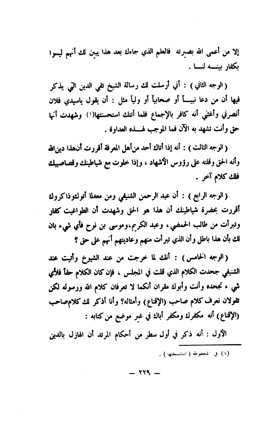الوجه الخامس: أنك لما خرجت من عند الشيوخ وأتيت عند الشنيفي، جحدت الكلام الذي قلتَ في المجلس. فإن كان الكلام حقاً فلأي شيء تجحده؟