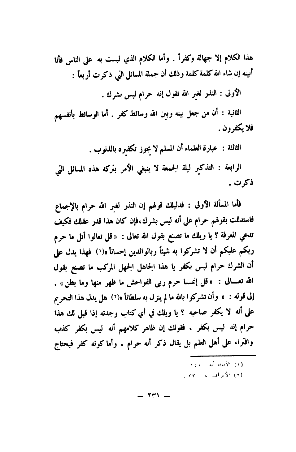 فأما المسألة الأولى: فدليلك: قولهم: إن النذر لغير الله حرام بالإجماع، فاستدللت بقولهم: حرام، على أنه ليس بشرك. فإن كان هذا قدر عقلك فكيف تدعي المعرفة؟ يا ويلك! ما تصنع بقول الله تعالى: {قُلْ تَعَالَوْا أَتْلُ مَا حَرَّمَ رَبُّكُمْ عَلَيْكُمْ أَلَّا تُشْرِكُوا بِهِ شَيْئاً وَبِالْوَالِدَيْنِ إِحْسَاناً} 1، فهذا يدل على أن الشرك حرام ليس بكفر؟ يا هذا الجاهل الجهل المركب! ما تصنع بقول الله تعالى: {قُلْ إِنَّمَا حَرَّمَ رَبِّيَ الْفَوَاحِشَ مَا ظَهَرَ مِنْهَا وَمَا بَطَنَ} 2 إلى قوله: {وَأَنْ تُشْرِكُوا بِاللَّهِ مَا لَمْ يُنَزِّلْ بِهِ سُلْطَاناً} 3، هل يدل هذا التحريم على أنه لا يكفر صاحبه؟ يا ويلك! في أي كتاب وجدته إذا قيل لك: هذا حرام، إنه ليس بكفر؟