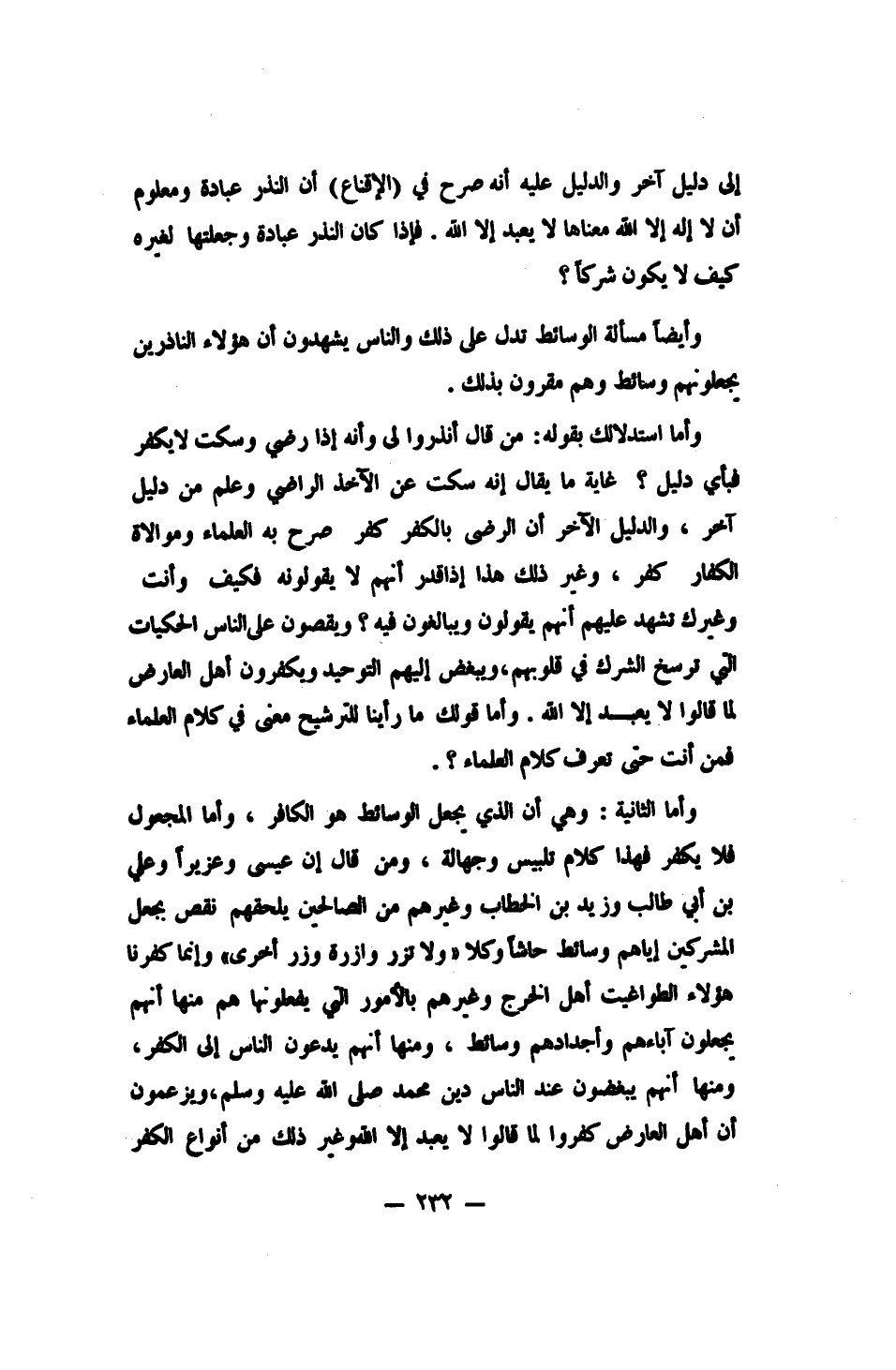 وأما الثانية: وهي أن الذي يجعل الوسائط هو الكافر، وأما المجعول فلا يكفر، فهذا كلام تلبيس وجهالة. ومن قال إن عيسى وعزيراً وعلي بن أبي طالب وزيد بن الخطاب وغيرهم من الصالحين، يلحقهم نقص بجعل المشركين إياهم وسائط؟ حاشا وكلا!: {وَلا تَزِرُ وَازِرَةٌ وِزْرَ أُخْرَى} 1، وإنما كفّرنا هؤلاء الطواغيت، أهل الخرج وغيرهم، بالأمور التي يفعلونها هم؛ منها: أنهم يجعلون آباءهم وأجدادهم وسائط. ومنها: أنهم يدعون الناس إلى الكفر. ومنها: أنهم يبغضون عند الناس دين محمد صلى الله عليه وسلم، ويزعمون أن أهل العارض كفروا لما قالوا: لا يعبد إلا الله، وغير ذلك من أنواع الكفر.