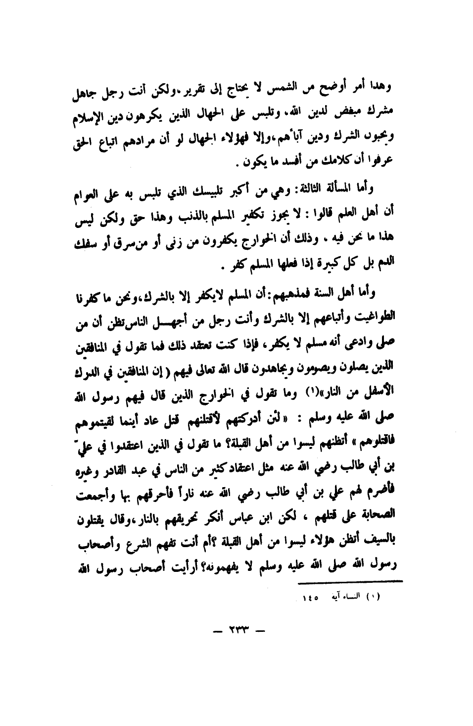 وأما المسألة الثالثة: وهي من أكبر تلبيسك الذي تلبس به على العوام، أن أهل العلم قالوا: لا يجوز تكفير المسلم بالذنب، وهذا حق، ولكن ليس هذا ما نحن فيه؛ وذلك أن الخوارج يكفّرون مَن زنى أو مَن سرق أو سفك الدم، بل كل كبيرة إذا فعلها المسلم كفر. وأما أهل السنة فمذهبهم: أن المسلم لا يكفر إلا بالشرك. ونحن ما كفّرنا الطواغيت وأتباعهم إلا بالشرك. وأنت رجل من أجهل الناس، تظن أن من صلى وادعى أنه مسلم لا يكفر. فإذا كنت تعتقد ذلك، فما تقول في المنافقين الذين يصلّون ويصومون ويجاهدون؟ قال الله تعالى فيهم: {إِنَّ الْمُنَافِقِينَ فِي الدَّرْكِ الأَسْفَلِ مِنَ النَّارِ} 1. وما تقول في الخوارج الذين قال فيهم رسول الله صلى الله عليه وسلم: " لئن أدركتهم لأقتلنّهم قتل عاد. أينما لقيتموهم فاقتلوهم " 2. أتظنهم ليسوا من أهل القبلة؟ ما تقول في الذين اعتقدوا في علي بن أبي طالب رضي الله عنه مثل اعتقاد كثير من الناس في عبد القادر وغيره، " فأضرم لهم علي بن أبي طالب رضي الله عنه ناراً فأحرقهم بها، وأجمعت الصحابة على قتلهم، لكن ابن عباس أنكر تحريقهم بالنار، وقال: يقتلون بالسيف ". أتظن هؤلاء ليسوا من أهل القبلة؟ أم أنت تفهم الشرع وأصحاب رسول الله صلى الله عليه وسلم لا يفهمونه؟ أرأيت أصحاب رسول الله