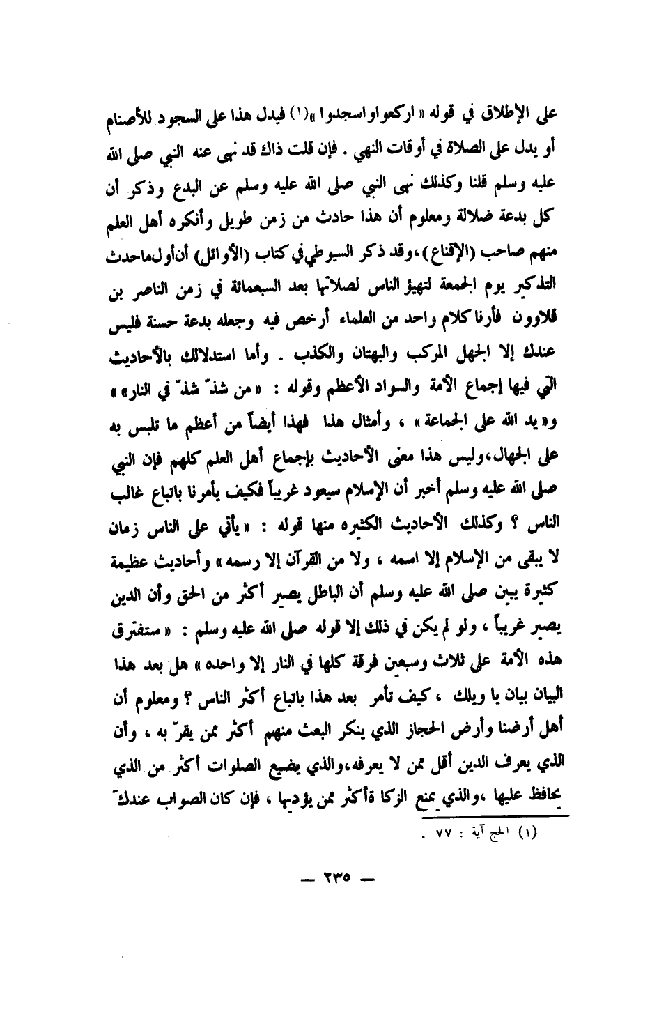 وأما استدلالك بالأحاديث التي فيها إجماع الأمة والسواد الأعظم، وقوله: " من شذ، شذ في النار " 2، و" يد الله على الجماعة " 3، وأمثال هذا، فهذا أيضاً من أعظم ما تلبس به على الجهال، وليس هذا معنى الأحاديث بإجماع أهل العلم كلهم؛ فإن النبي صلى الله عليه وسلم أخبر أن الإسلام سيعود غريباً، فكيف يأمرنا باتباع غالب الناس؟ وكذلك الأحاديث الكثيرة، منها قوله: " يأتي على الناس زمان، لا يبقى من الإسلام إلا اسمه، ولا من القرآن إلا رسمه "، وأحاديث عظيمة كثيرة، يبين صلى الله عليه وسلم أن الباطل يصير أكثر من الحق، وأن الدين يصير غريباً. ولو لم يكن في ذلك إلا قوله صلى الله عليه وسلم: " ستفترق هذه الأمة على ثلاث وسبعين فرقة، كلها في النار، إلا واحدة " 4، هل بعد هذا البيان بيان؟ يا ويلك! كيف تأمر بعد هذا باتباع أكثر الناس؟