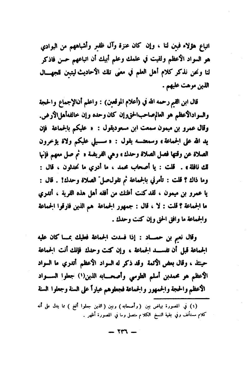 قال ابن القيم، رحمه الله، في إعلام الموقعين: واعلم أن الإجماع والحجة والسواد الأعظم هو: العالم صاحب الحق، وإن كان وحده، وإن خالفه أهل الأرض. وقال عمرو بن ميمون: سمعت ابن مسعود يقول: " عليكم بالجماعة! فإن يد الله على الجماعة "، وسمعته يقول: " سيلي عليكم ولاة يؤخرون الصلاة عن وقتها، فصلّ الصلاة وحدك وهي الفريضة، ثم صل معهم فإنها لك نافلة. قلت: يا أصحاب محمد، ما أدري ما تحدثون. قال: وما ذاك؟ قلت: تأمرني بالجماعة، ثم تقول: صل الصلاة وحدك! قال: يا عمرو بن ميمون، لقد كنت أظنك مِن أفقه أهل هذه القرية. أتدري ما الجماعة؟ قلت: لا، قال: جمهور الجماعة هم الذين فارقوا الجماعة. والجماعة: ما وافق الحق وإن كنت وحدك ".