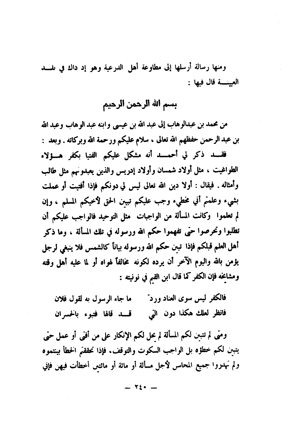 -5- الرسالة الخامسة والثلاثون ومنها رسالة أرسلها إلى مطاوعة أهل الدرعية، وهو إذ ذاك في بلد العيينة، قال فيها: بسم الله الرحمن الرحيم