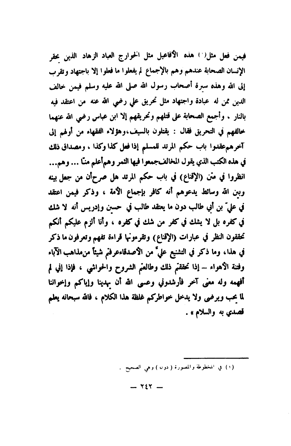 فيمن فعل مثل 1 هذه الأفاعيل، مثل الخوارج العباد الزهاد، الذين يحقر الإنسان الصحابة عندهم، وهم بالإجماع لم يفعلوا ما فعلوا إلا باجتهاد وتقرب إلى الله. وهذه سيرة أصحاب رسول الله صلى الله عليه وسلم فيمن خالف الدين، ممن له عبادة واجتهاد، مثل: " تحريق علي رضي الله عنه من اعتقد فيه بالنار، وأجمع الصحابة على قتلهم وتحريقهم إلا ابن عباس، رضي الله عنهما، خالفهم في التحريق، فقال: يُقتلون بالسيف ".
