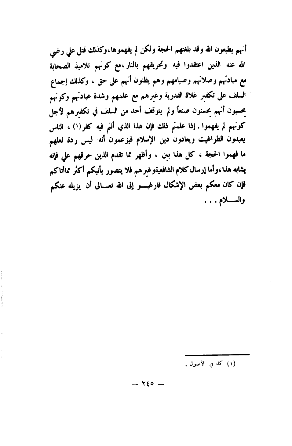 أنهم يطيعون الله، وقد بلغتهم الحجة ولكن لم يفهموها. وكذلك " قتل علي رضي الله عنه الذين اعتقدوا فيه، وتحريقهم بالنار "، مع كونهم تلاميذ الصحابة مع مبادئهم وصلاتهم وصيامهم، وهم يظنون أنهم على حق. وكذلك إجماع السلف على تكفير غلاة القدرية وغيرهم، مع علمهم وشدة عبادتهم، وكونهم يحسبون أنهم يحسنون صنعاً، ولم يتوقف أحد من السلف في تكفيرهم لأجل كونهم لم يفهموا.