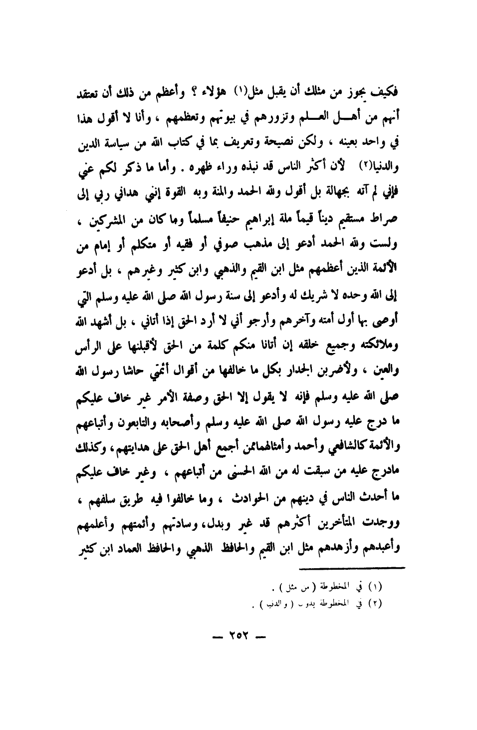 وأما ما ذكر لكم عني، فإني لم آته بجهالة، بل أقول، ولله الحمد والمنة، وبه القوة: إنني هداني ربي إلى صراط مستقيم، ديناً قيماً ملة إبراهيم حنيفاً مسلماً وما كان من المشركين. ولست، ولله الحمد، أدعو إلى مذهب صوفي، أو فقيه، أو متكلم، أو إمام من الأئمة الذين أُعظِّمهم مثل ابن القيم والذهبي وابن كثير وغيرهم، بل أدعو إلى الله وحده لا شريك له، وأدعو إلى سنة رسول الله صلى الله عليه وسلم التي أوصى بها أول أمته وآخرهم. وأرجو أني لا أرد الحق إذا أتاني؛ بل أُشهد الله وملائكته وجميع خلقه، إن أتانا منكم كلمة من الحق لأقبلنّها على الرأس والعين، ولأضربن الجدار بكل ما خالفها، من أقوال أئمتي، حاشا رسول الله صلى الله عليه وسلم، فإنه لا يقول إلا الحق.