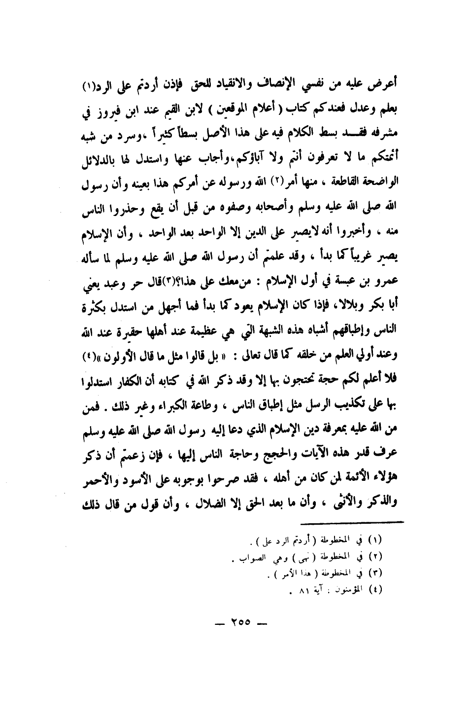 أعرض عليه من نفسي الإنصاف والانقياد للحق، فإذا أردتم علي الرد 1 بعلم وعدل، فعندكم كتاب إعلام الموقعين لابن القيم عند ابن فيروز في مشرفه، فقد بسط الكلام فيه على هذا الأصل بسطاً كثيراً، وسرد من شبه أئمتكم ما لا تعرفون أنتم ولا آباؤكم، وأجاب عنها واستدل لها بالدلائل الواضحة القاطعة؛ منها: أمر 2 الله ورسوله عن أمركم هذا بعينه، وأن رسول الله صلى الله عليه وسلم وأصحابه وصفوه من قبل أن يقع، وحذروا الناس منه، وأخبروا أنه لا يصير على الدين إلا الواحد بعد الواحد، وأن الإسلام يصير غريباً كما بدأ.
