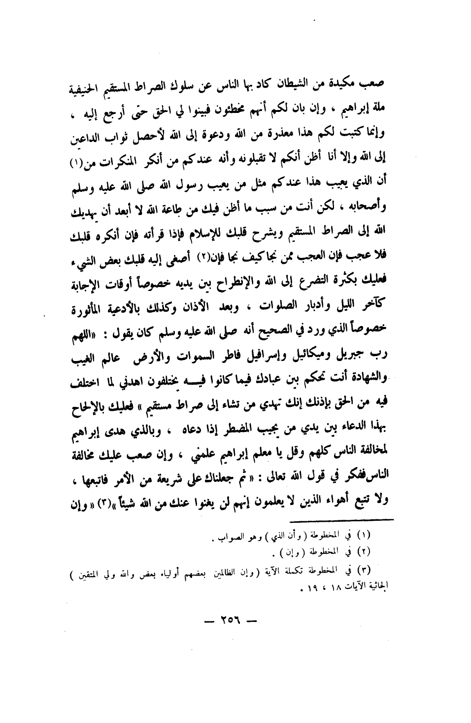 لكن أنت من سبب ما أظن فيك من طاعة الله، لا أبعد أن يهديك الله إلى الصراط المستقيم، ويشرح قلبك للإسلام. فإذا قرأته، فإن أنكره قلبك فلا عجب؛ فإن العجب ممن نجا كيف نجا؟ فإن 2 أصغى إليه قلبك بعض الشيء، فعليك بكثرة التضرع إلى الله والانطراح بين يديه، خصوصاً أوقات الإجابة كآخر الليل، وأدبار الصلوات، وبعد الأذان، وكذلك بالأدعية المأثورة خصوصاً الذي ورد في الصحيح أنه صلى الله عليه وسلم كان يقول: " اللهم رب جبريل وميكائيل وإسرافيل، فاطر السموات والأرض، عالم الغيب والشهادة، أنت تحكم بين عبادك فيما كانوا فيه يختلفون. اهدني لما اختُلف فيه من الحق بإذنك، إنك تهدي من تشاء إلى صراط مستقيم " 3.