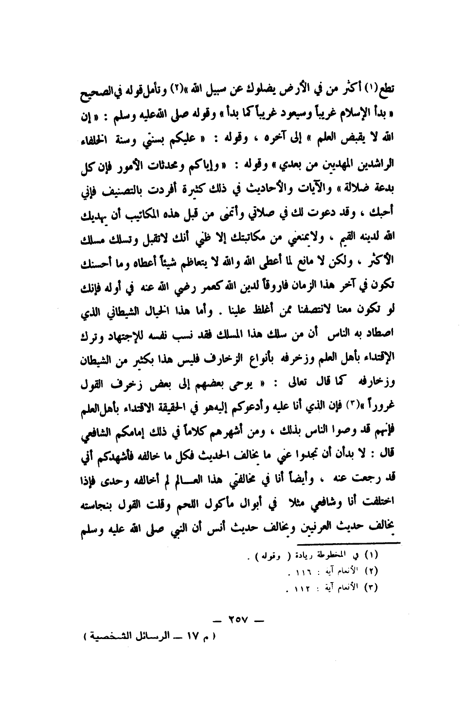 تُطِعْ أَكْثَرَ مَنْ فِي الأَرْضِ يُضِلُّوكَ عَنْ سَبِيلِ اللَّهِ} 1. وتأمل قوله في الصحيح: " بدأ الإسلام غريباً، وسيعود غريباً كما بدأ " 2، وقوله صلى الله عليه وسلم: " إن الله لا يقبض العلم ... إلخ " 3، وقوله: " عليكم بسنتي وسنة الخلفاء الراشدين المهديين من بعدي " 4، وقوله: " وإياكم ومحدثات الأمور! فإن كل بدعة ضلالة " 5. والآيات والأحاديث في ذلك كثيرة، أفردت بالتصنيف.