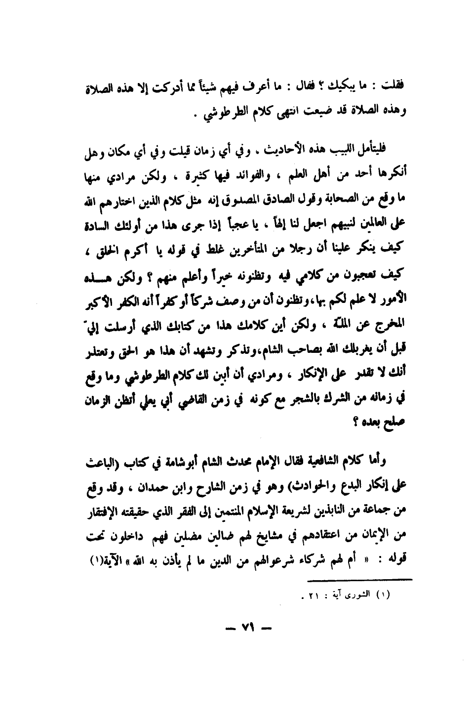 وأما كلام الشافعية، فقال الإمام محدث الشام: أبو شامة في كتاب "الباعث على إنكار البدع والحوادث"، وهو في زمن الشارح وابن حمدان: وقد وقع من جماعة من النابذين لشريعة الإسلام، المنتمين إلى الفقر الذي حقيقته الافتقار من الإيمان، من اعتقادهم في مشايخ لهم ضالين مضلين، فهم داخلون تحت قوله: {أَمْ لَهُمْ شُرَكَاءُ شَرَعُوا لَهُمْ مِنَ الدِّينِ مَا لَمْ يَأْذَنْ بِهِ اللَّهُ} 1 الآية.
