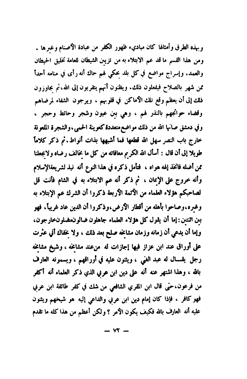 فتأمل ذكره في هذا النوع، أنه نبذ لشريعة الإسلام، وأنه خروج على الإيمان، ثم ذكر أنه عم الابتلاء به في الشام. فأنت قل لصاحبكم: هؤلاء العلماء من الأئمة الأربعة ذكروا أن الشرك عم الابتلاء به وغيره، وصاحوا بأهله من أقطار الأرض، وذكروا أن الدين عاد غريباً. فهو بين اثنتين: إما أن يقول: كل هؤلاء العلماء جاهلون، ضالون مضلون خارجون، وإما أن يدعي أن زمانه وزمان مشايخه صلح بعد ذلك.