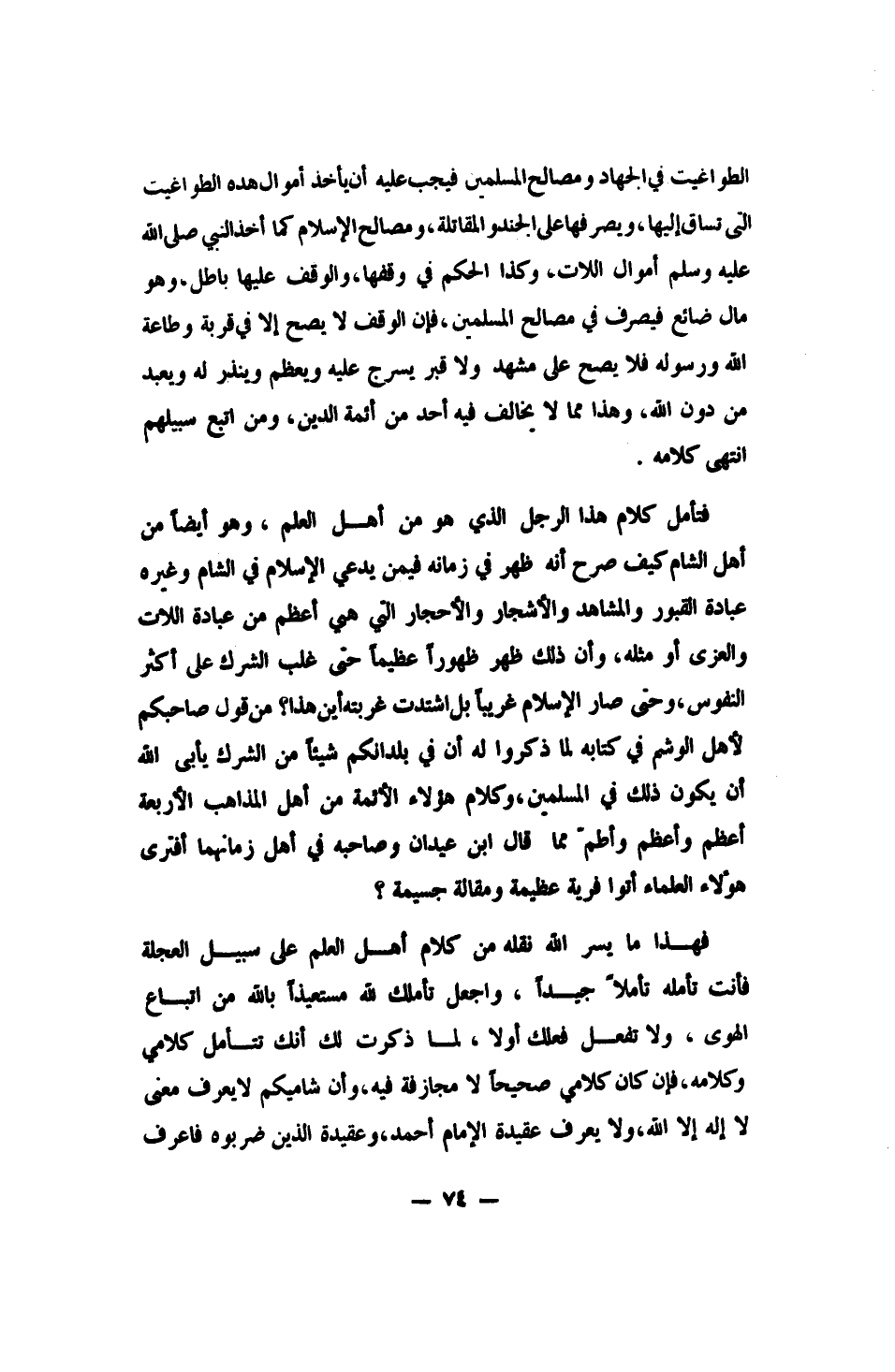 فتأمل كلام هذا الرجل الذي هو من أهل العلم، وهو أيضاً من أهل الشام، كيف صرح أنه ظهر في زمانه فيمن يدعي الإسلام في الشام وغيره عبادة القبور والمشاهد، والأشجار والأحجار، التي هم أعظم من عبادة اللات والعزى أو مثله، وأن ذلك ظهر ظهوراً عظيماً حتى غلب الشرك على أكثر النفوس، وحتى صار الإسلام غريباً، بل اشتدت غربته. أين هذا من قول صاحبكم لأهل الوشم في كتابه، لما ذكروا له أن في بلدانكم شيئاً من الشرك: يأبى الله أن يكون ذلك في المسلمين. وكلام هؤلاء الأئمة من أهل المذاهب الأربعة، أعظم وأعظم وأطمّ مما قال ابن عيدان وصاحبه في أهل زمانهما، أفَترى هؤلاء العلماء أتوا فرية عظيمة ومقالة جسيمة؟