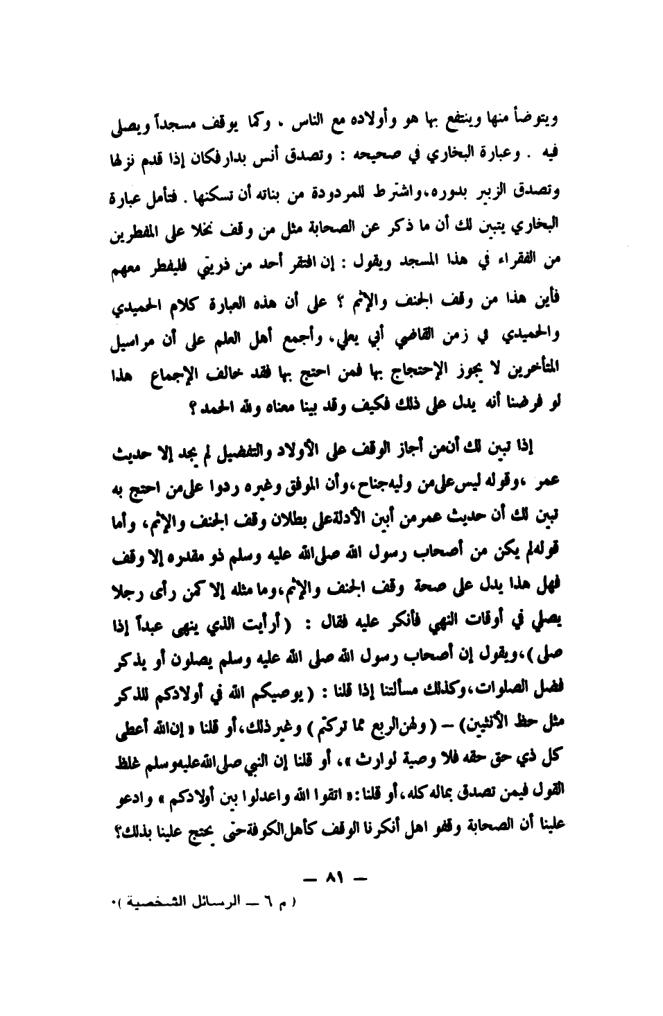 وعبارة البخاري في صحيحه: " وتصدق أنس بدار، فكان إذا قدم نزلها "، " وتصدق الزبير بدوره، واشترط للمردودة من بناته أن تسكنها ". فتأمل عبارة البخاري، يتبين لك أن ما ذكر عن الصحابة، مثل من وقف نخلاً على المفطرين من الفقراء في هذا المسجدن ويقول: إن افتقر أحد من ذريتي فليفطر معهم، فأين هذا من وقف الجنف والإثم؟ على أن هذه العبارة كلام الحميدي، والحميدي في زمن القاضي أبي يعلى، وأجمع أهل العلم على أن مراسيل المتأخرين لا يجوز الاحتجاج بها، فمن احتج بها فقد خالف الإجماع. هذا لو فرضنا أنه يدل على ذلك، فكيف وقد بينا معناه ولله الحمد؟