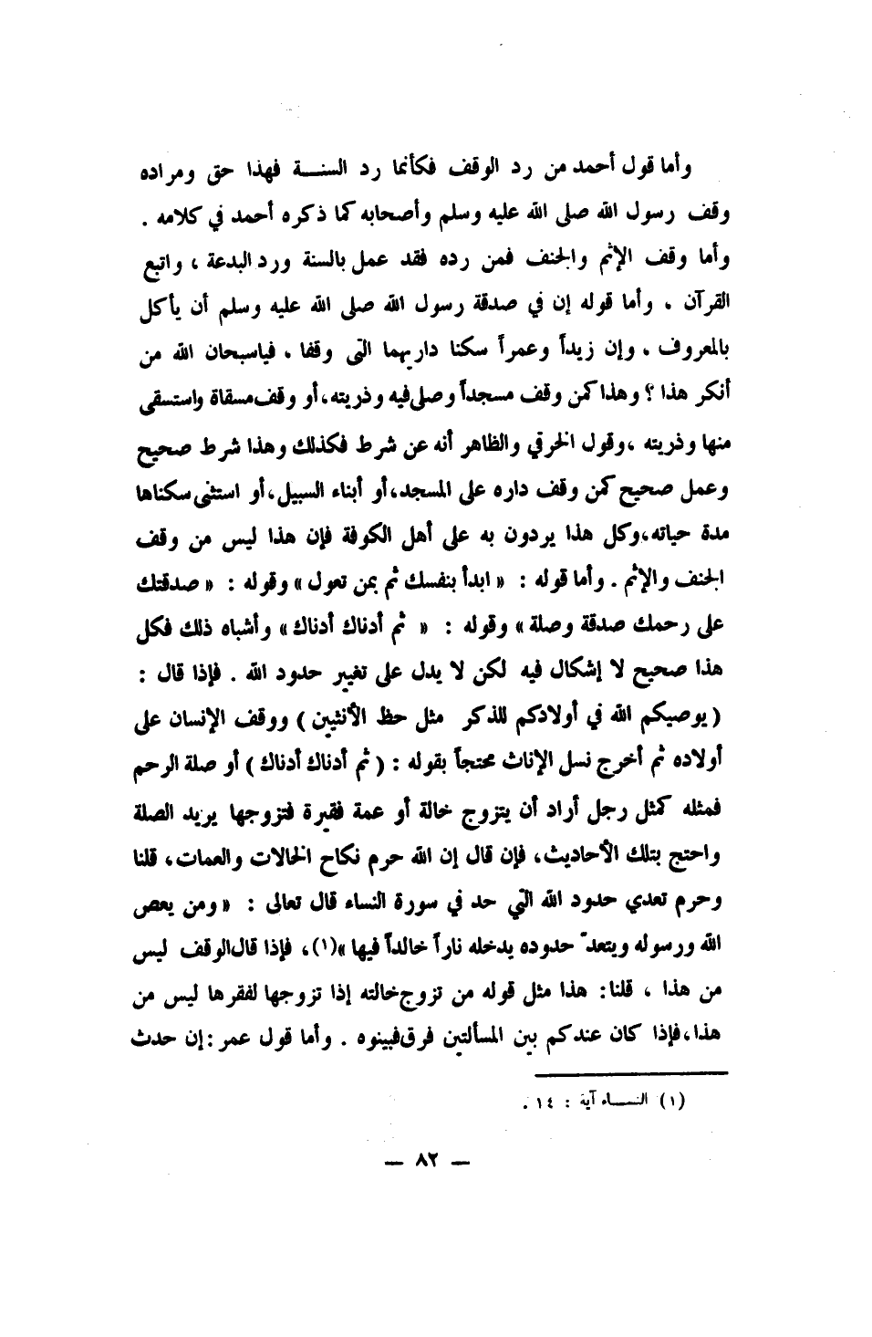 وأما قول أحمد: من رد الوقف فكأنما رد السنة، فهذا حق، ومراده وقف رسول الله صلى الله عليه وسلم وأصحابه كما ذكره أحمد في كلامه. وأما وقف الإثم والجنف، فمن رده فقد عمل بالسنة وردّ البدعة، واتبع القرآن.