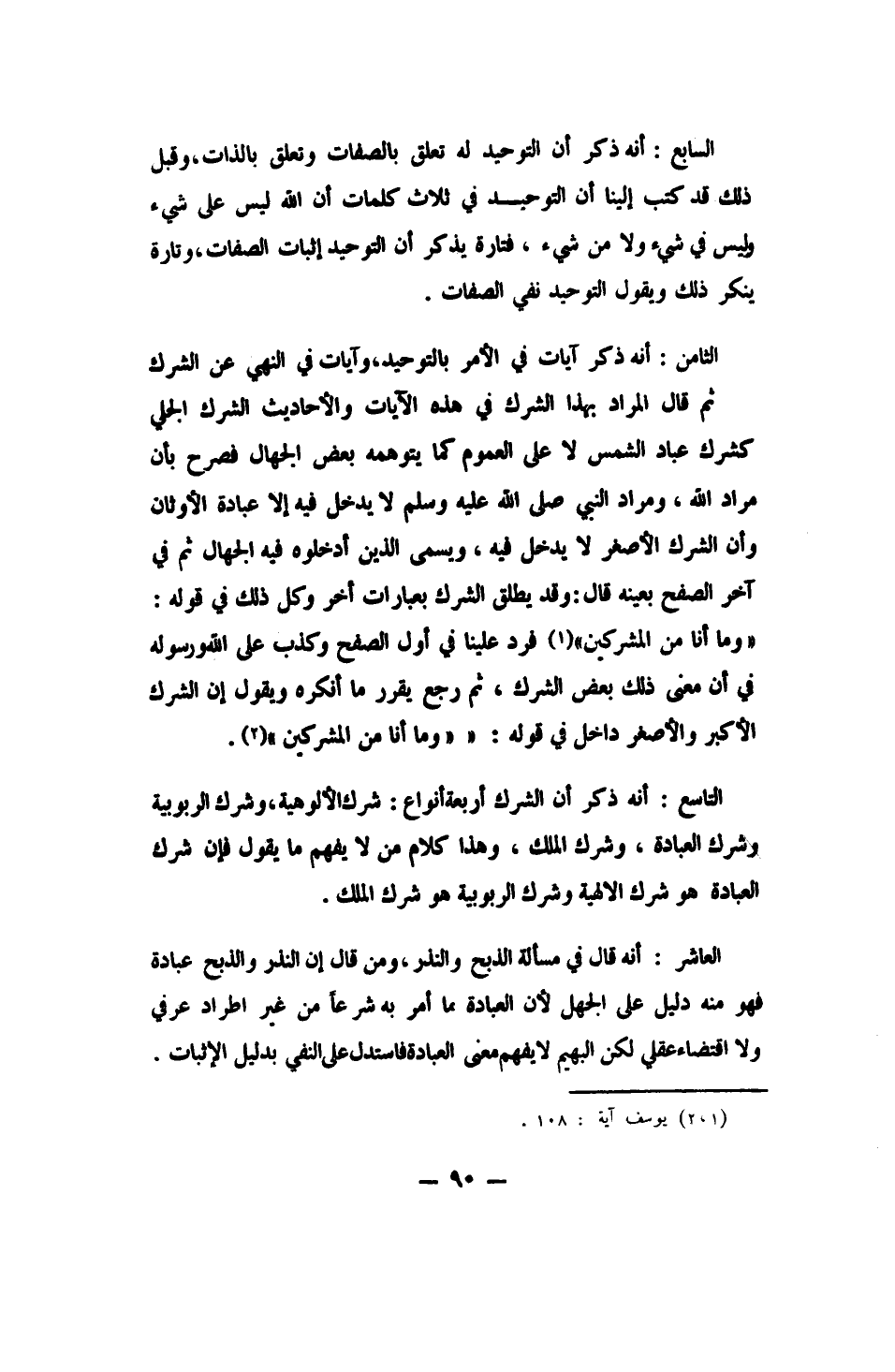 الثامن: أنه ذكر آيات في الأمر بالتوحيد، وآيات في النهي عن الشرك، ثم قال: المراد بهذا الشرك في هذه الآيات والأحاديثك الشرك الجلي، كشرك عباد الشمس، لا على العموم كما يتوهمه بعض الجهال. فصرح بأن مراد الله ومراد النبي صلى الله عليه وسلم لا يدخل فيه إلا عبادة الأوثان، وأن الشرك الأصغر لا يدخل فيه، ويسمي الذين أدخلوه فيه الجهال. ثم في آخر الصفح بعينه قال: وقد يطلق الشرك بعبارات أخر، وكل ذلك في قوله: {وَمَا أَنَا مِنَ الْمُشْرِكِينَ} 1، فرد علينا في أول الصفح، وكذب على الله ورسوله في أن معنى ذلك بعض الشرك. ثم رجع يقرر ما أنكره، ويقول: إن الشرك الأكبر والأصغر داخل في قوله: {وَمَا أَنَا مِنَ الْمُشْرِكِينَ} 2.