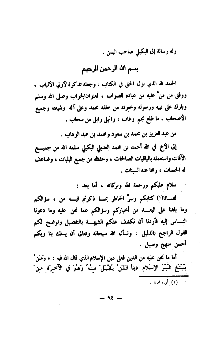 أما بعد، لفانا1 كتابكم، وسر الخاطر بما ذكرتم فيه من سؤالكم، وما بلغنا على البعد من أخباركم، وسؤالكم عما نحن عليه، وما دعونا الناس إليه؛ فأردنا أن نكشف عنكم الشبهة بالتفصيل، ونوضح لكم القول الراجح بالدليل، ونسأل الله سبحانه وتعالى أن يسلك بنا وبكم أحسن منهج وسبيل.