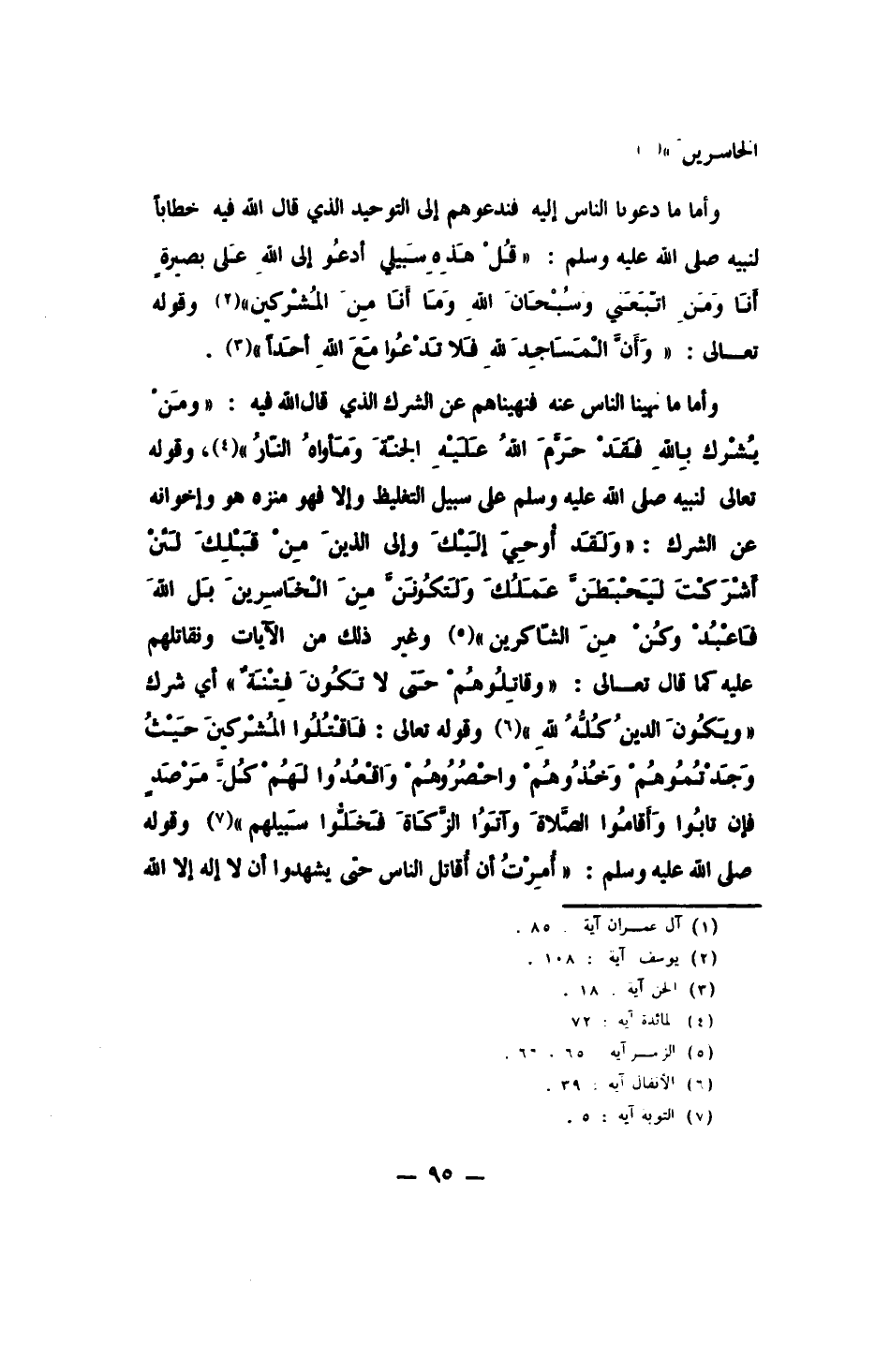 الْخَاسِرِينَ} 1. وأما ما دعونا الناس إليه، فندعوهم إلى التوحيد الذي قال الله فيه، خطاباً لنبيه صلى الله عليه وسلم: {قُلْ هَذِهِ سَبِيلِي أَدْعُو إِلَى اللَّهِ عَلَى بَصِيرَةٍ أَنَا وَمَنِ اتَّبَعَنِي وَسُبْحَانَ اللَّهِ وَمَا أَنَا مِنَ الْمُشْرِكِينَ} 2 وقوله تعالى: {وَأَنَّ الْمَسَاجِدَ لِلَّهِ فَلا تَدْعُو مَعَ اللَّهِ أَحَداً} 3.